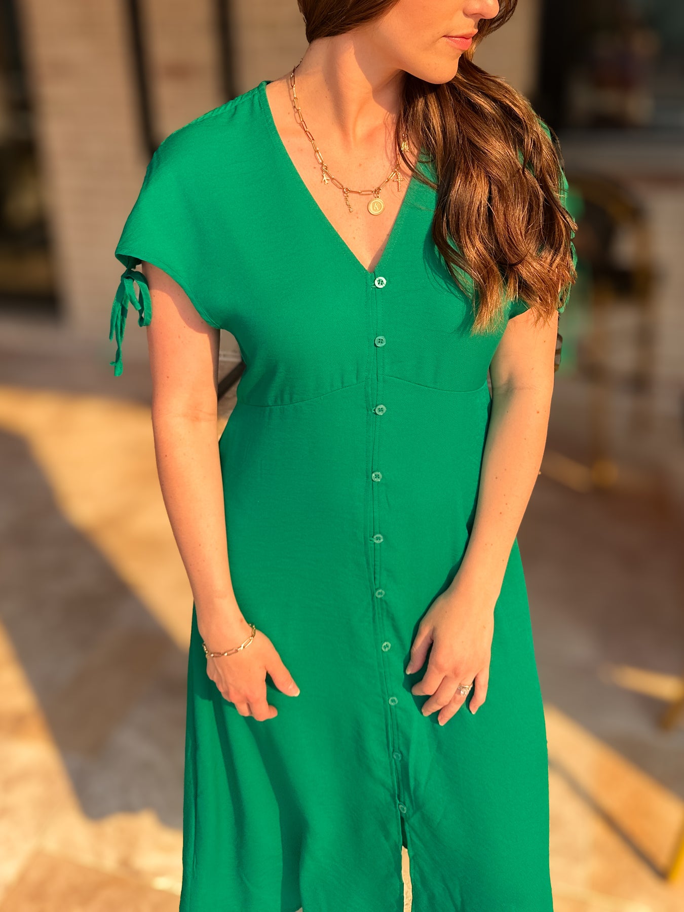 Do you like a solid color dress? This short sleeve midi dress done in a beautiful green fabric, has an adjustable sleeve tie detail. It has a V-neck with a full button-down front. Keep it simple with subtle jewelry or make it rock with bold statement pieces.