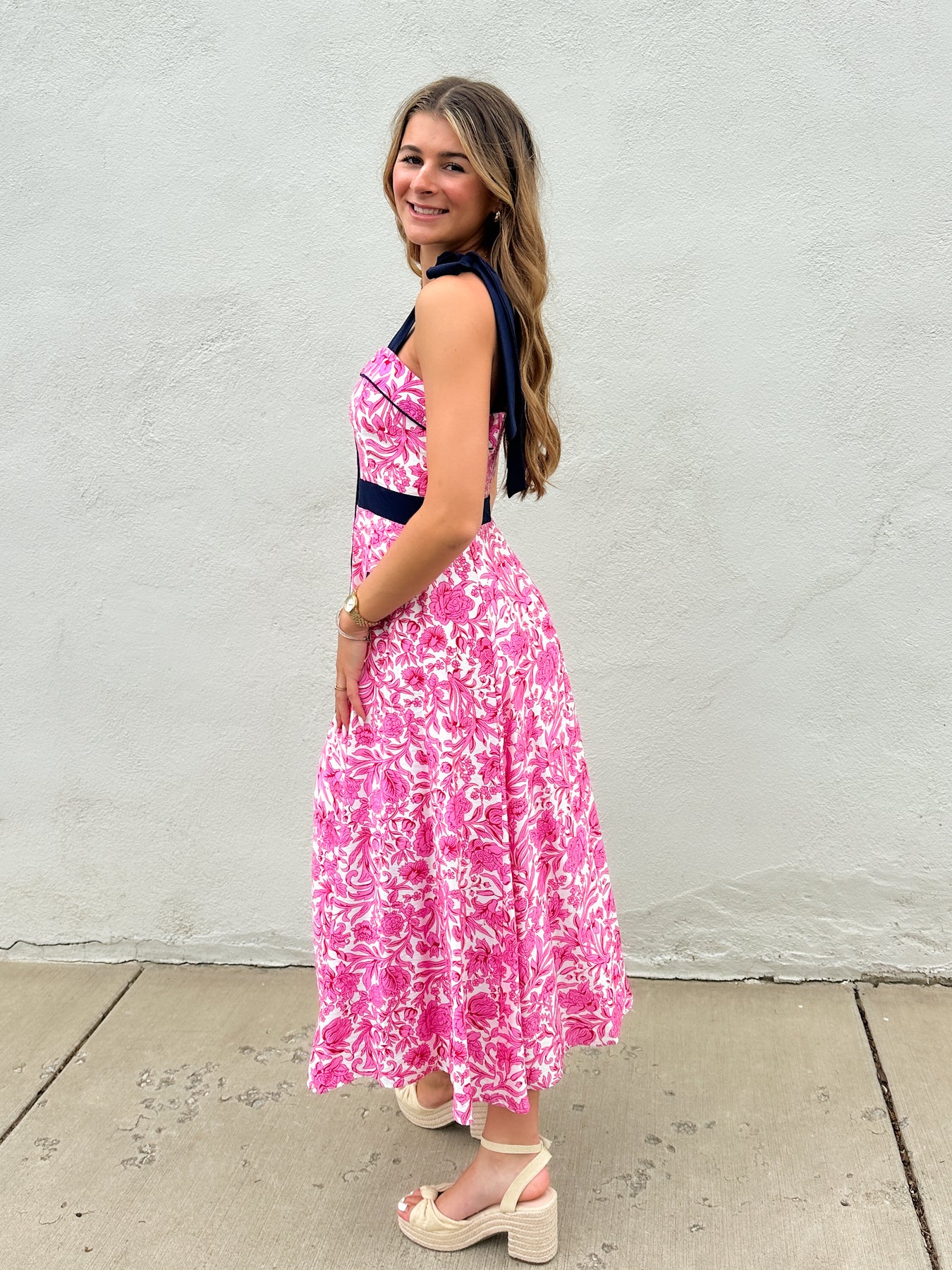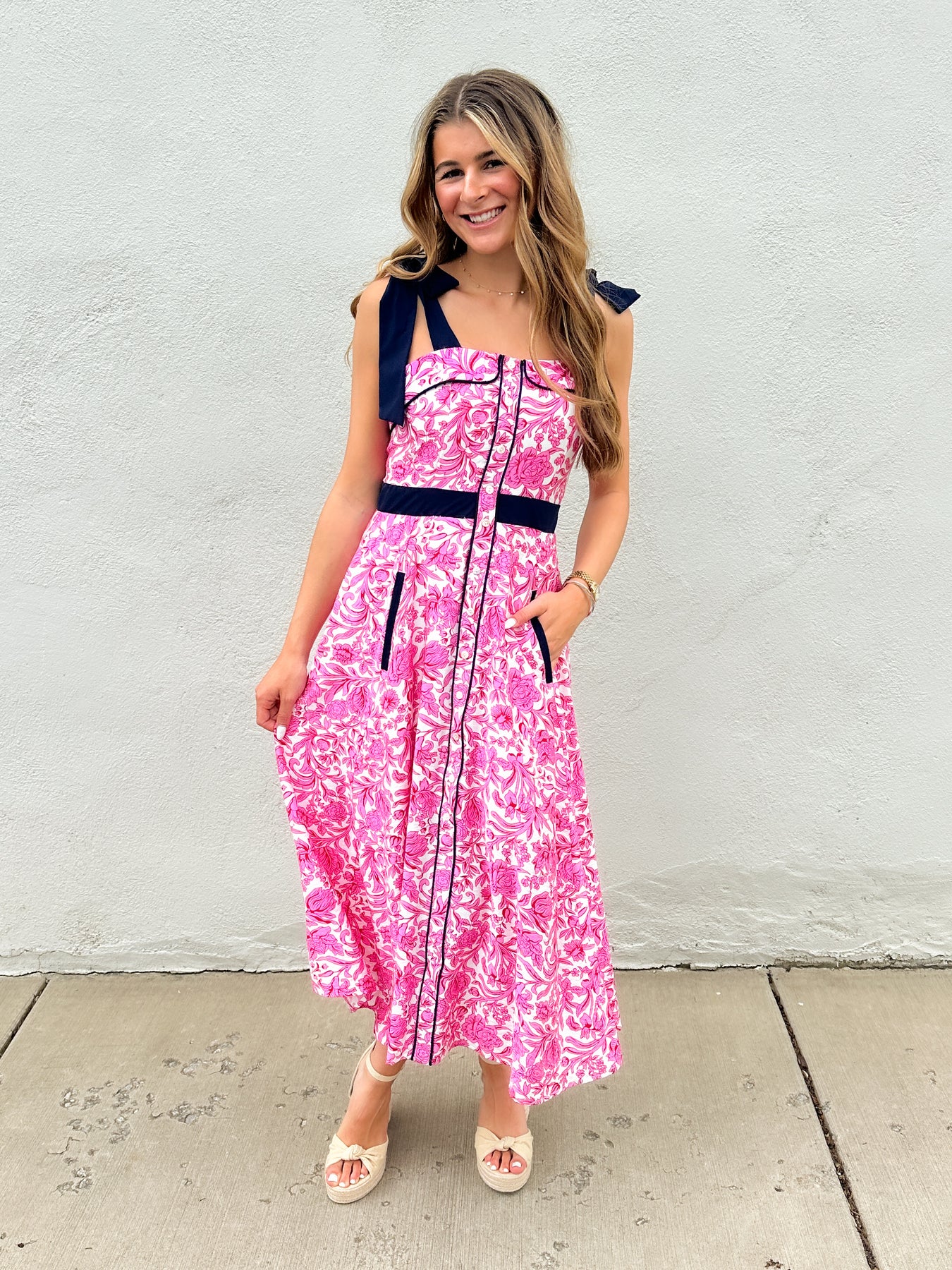 Bright, feminine, and comfortable. This is one of our new favorites. This hot pink floral with the navy accents is so on trend. Button front, large shoulder ties, and a smocked back are just a few details that make this dress so great.
