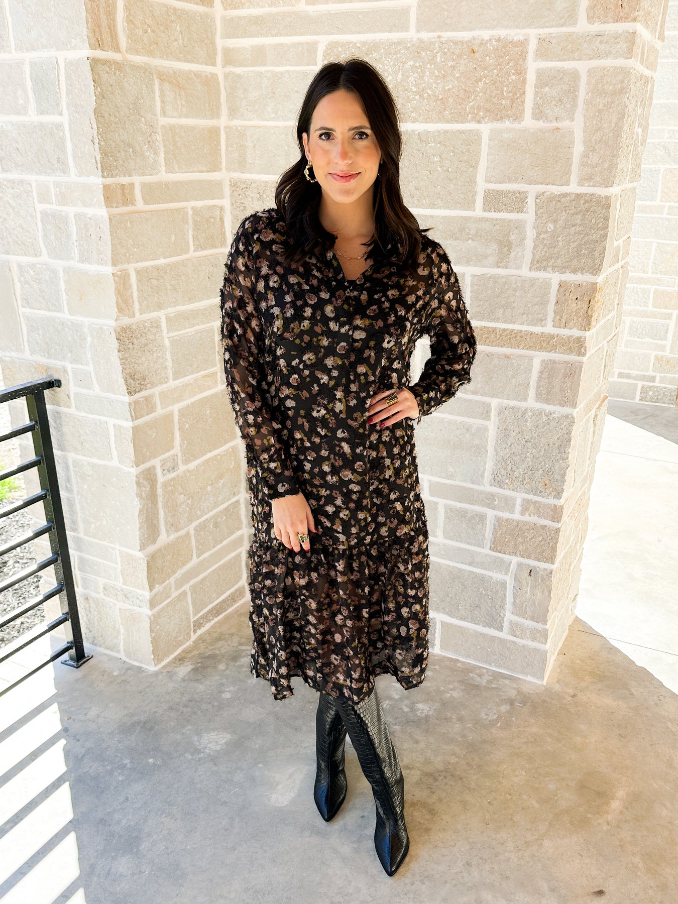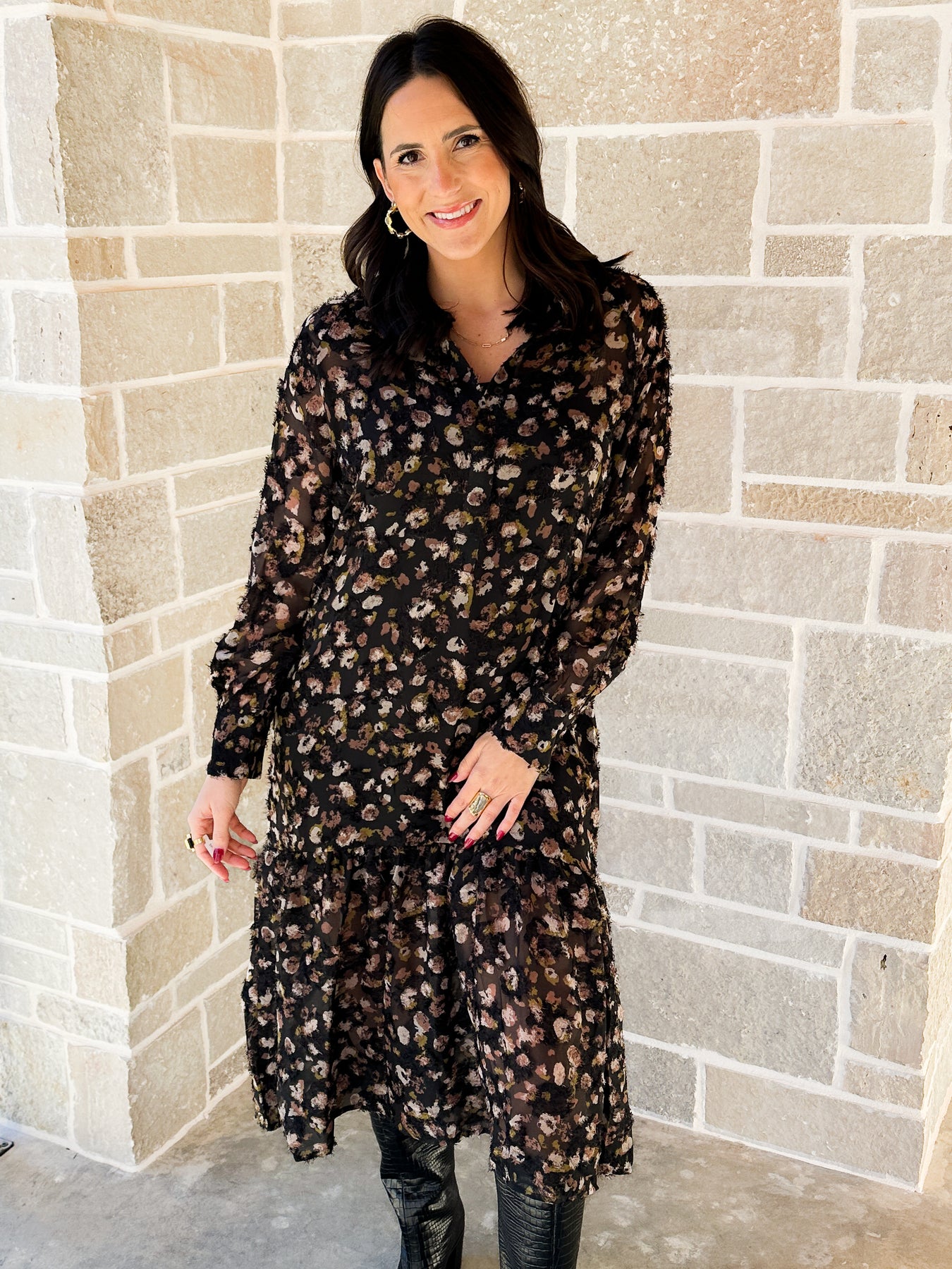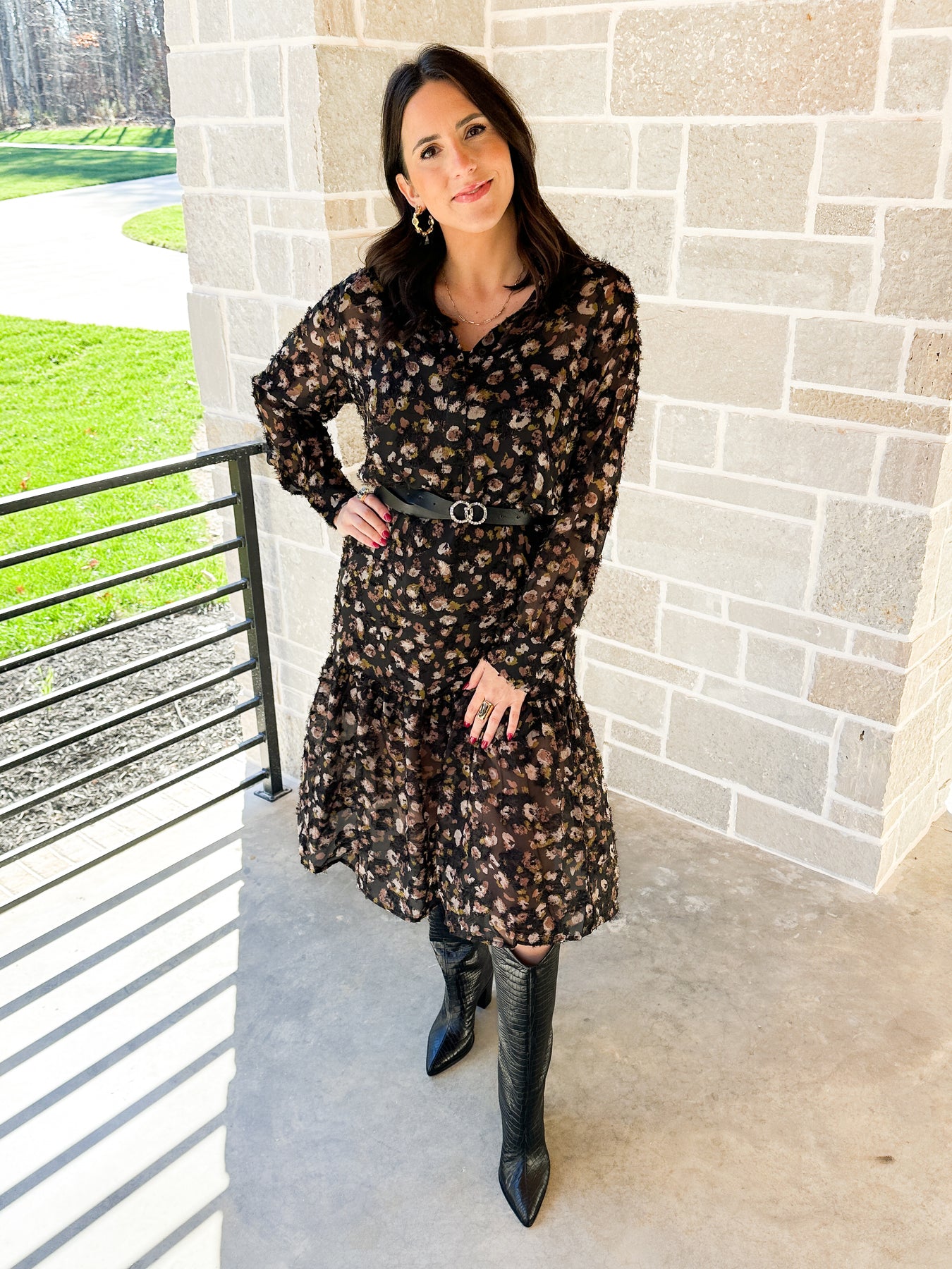 This maxi dress is flowy and fabulous. Done in an animal print fabric, this button front dress has a long sleeve, collar, and button cuff. Add your favorite belt for a different look.