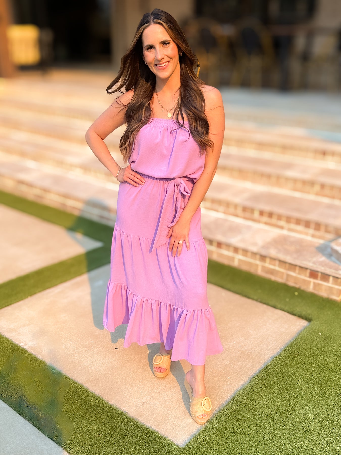 Beautiful fabric and a flattering body style. This strapless, maxi dress has an elastic waistband with removable tie and a tiered skirt. The color is stunning.