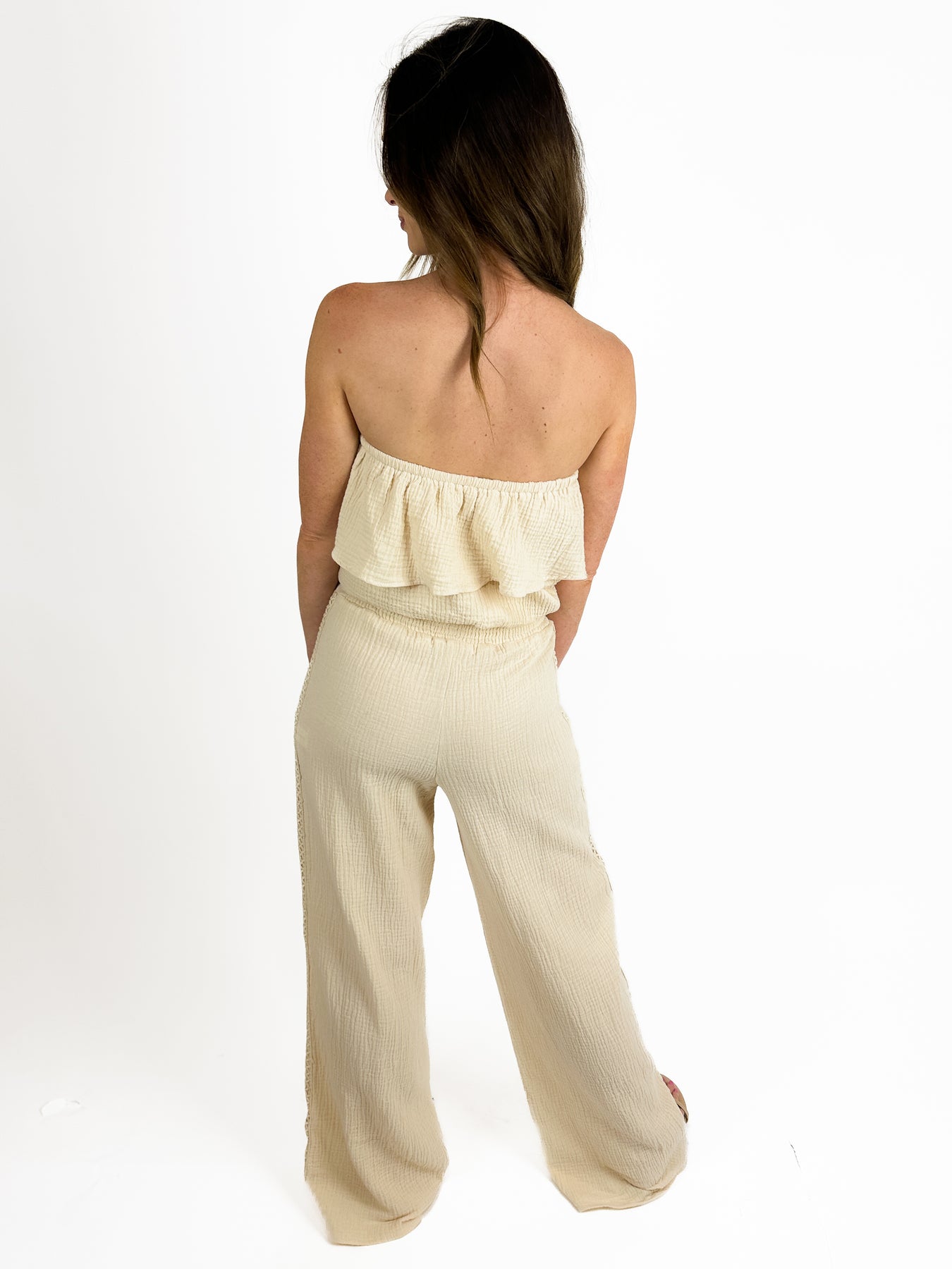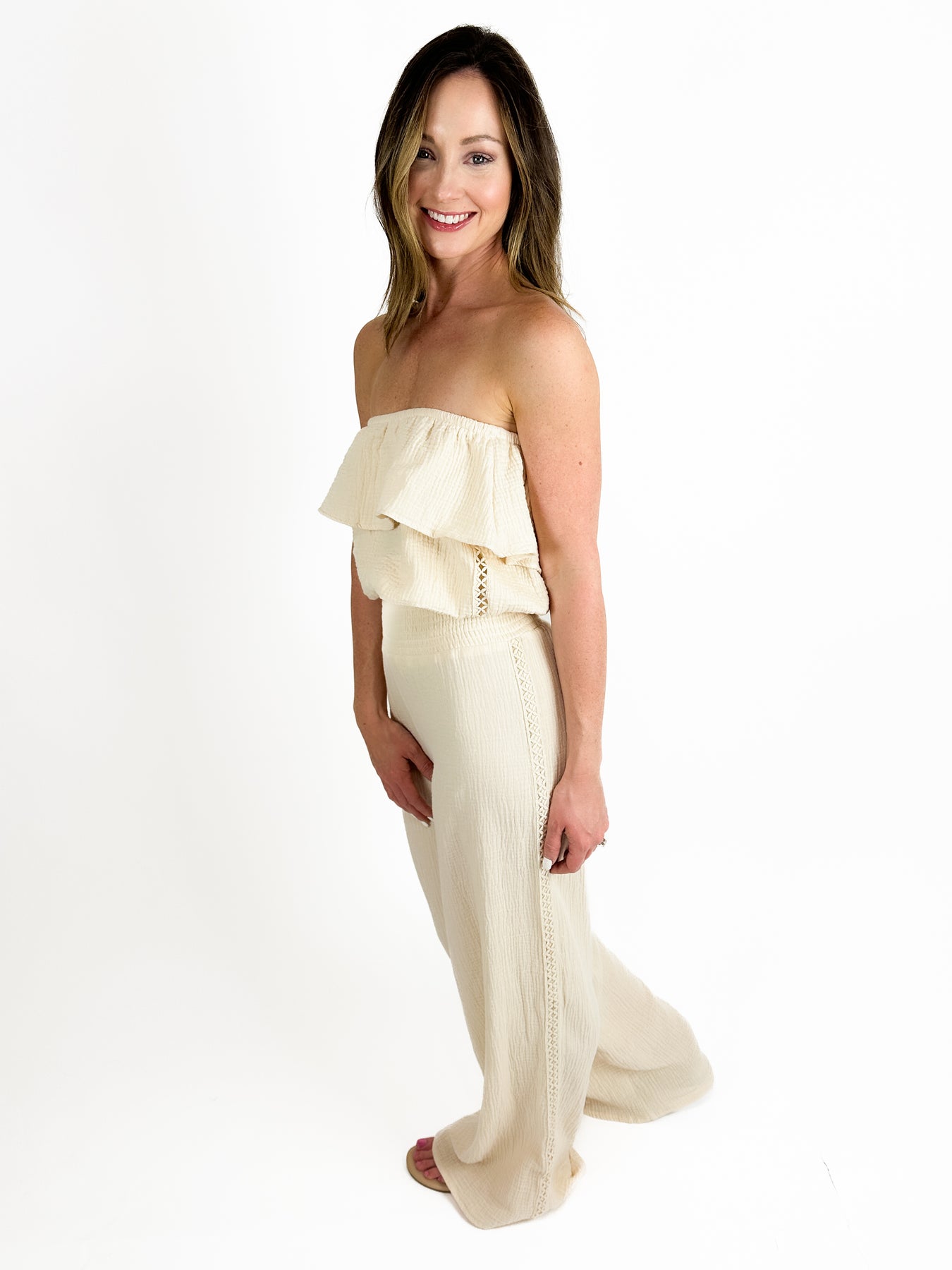 Pants that you pull on are an easy choice. With a wide elastic waistband and a wide leg, the neutral gauze fabric makes these pants cool and comfortable. The X-pattern rick-rack trim on the side seams make these pants extra special. Pair them with the matching top (sold separately) or with any other favorite.