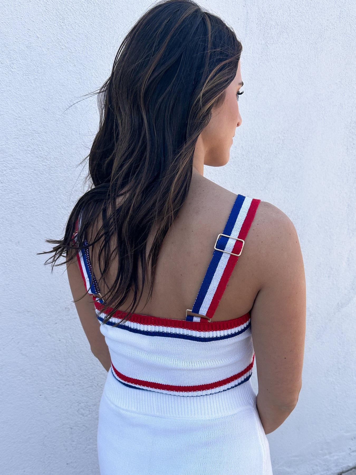 Love red, white, and blue? You’ll love this little knit tank. Straps are adjustable. Pair this with the Below Deck Miniskirt (sold separately) or with a pair of denim shorts.