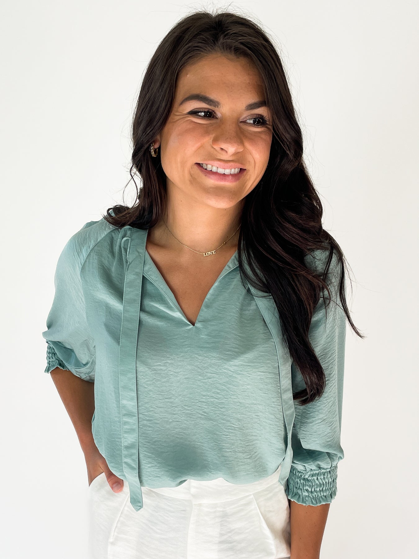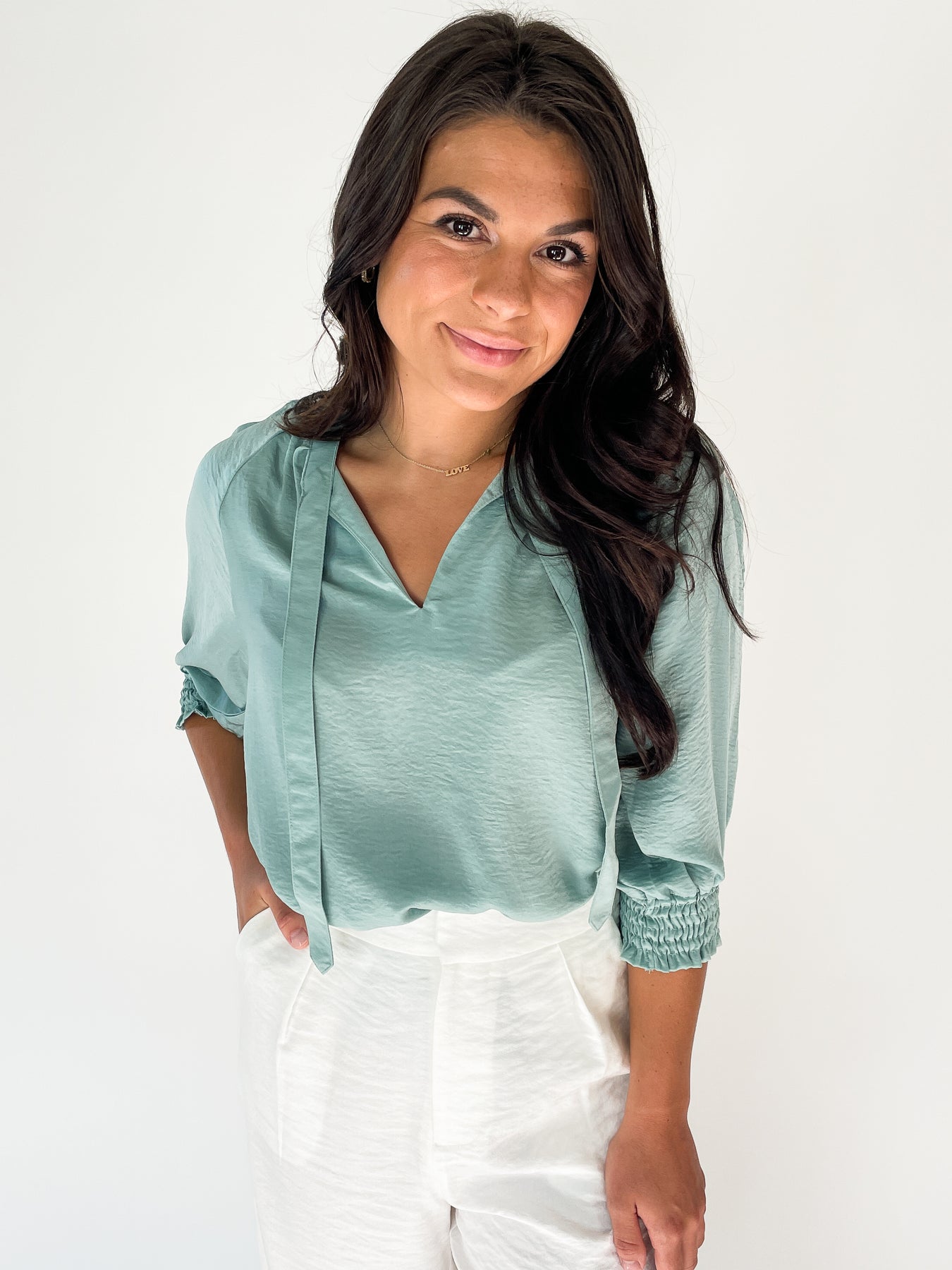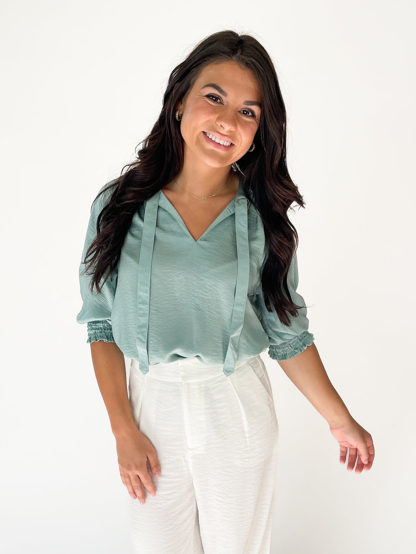 Our new favorite top has arrived. The soft, solid fabric in a beautiful blue/green color is sure to make it one of your favorites too. This top features a V neck, short sleeves with elastic detail and a tie for extra pizzaz. Tucked or untucked pairs with your favorite bottoms. 100% polyester. Model is wearing a small.