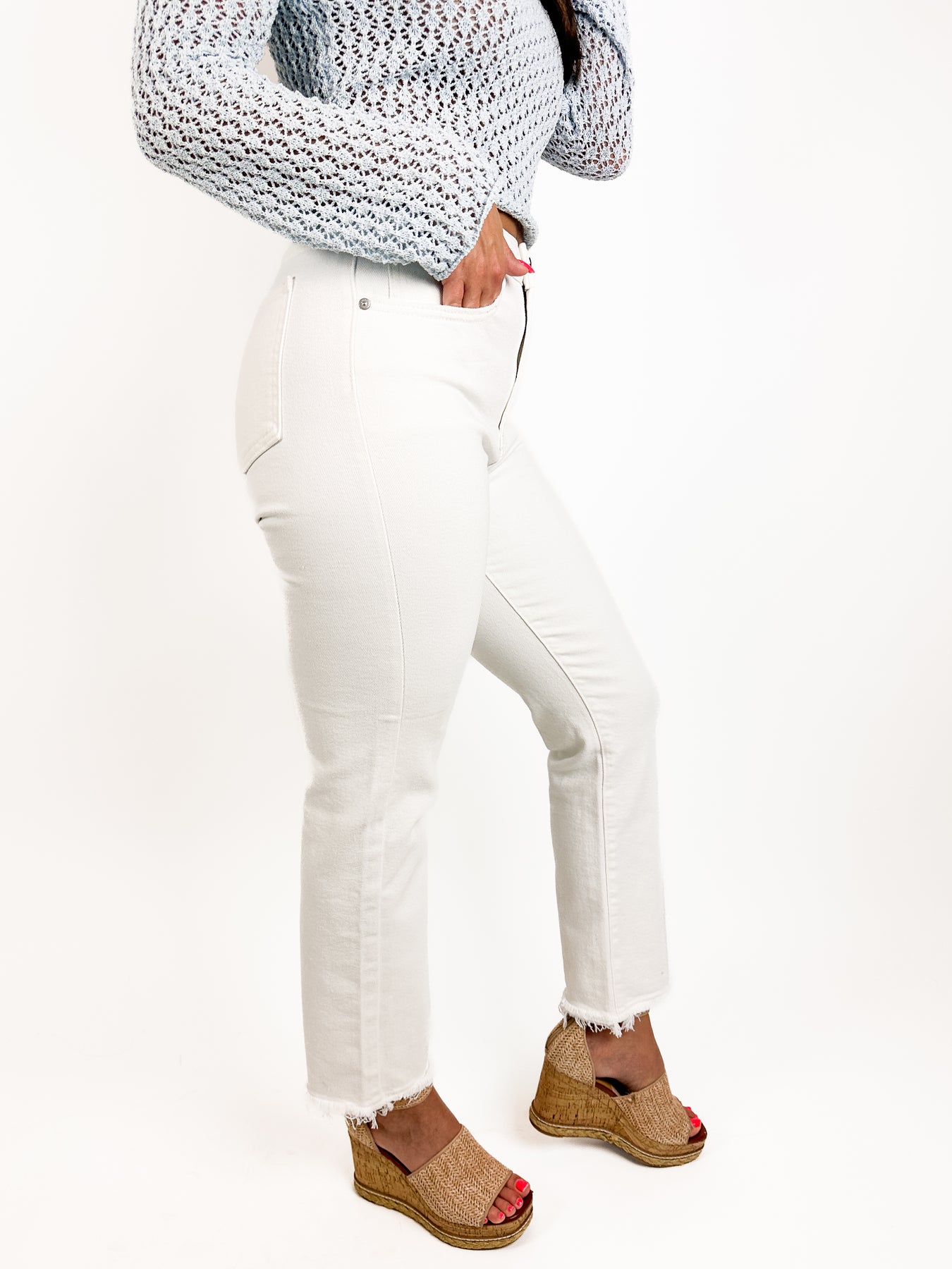White denim is a favorite piece of clothing. These on trend, straight leg, high waisted, with a fringe hem are a must have.