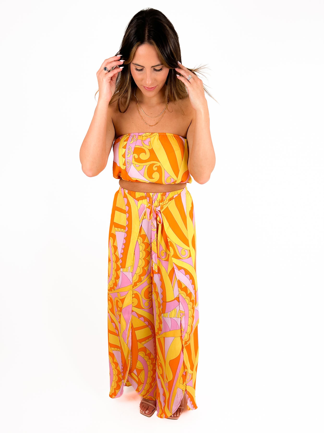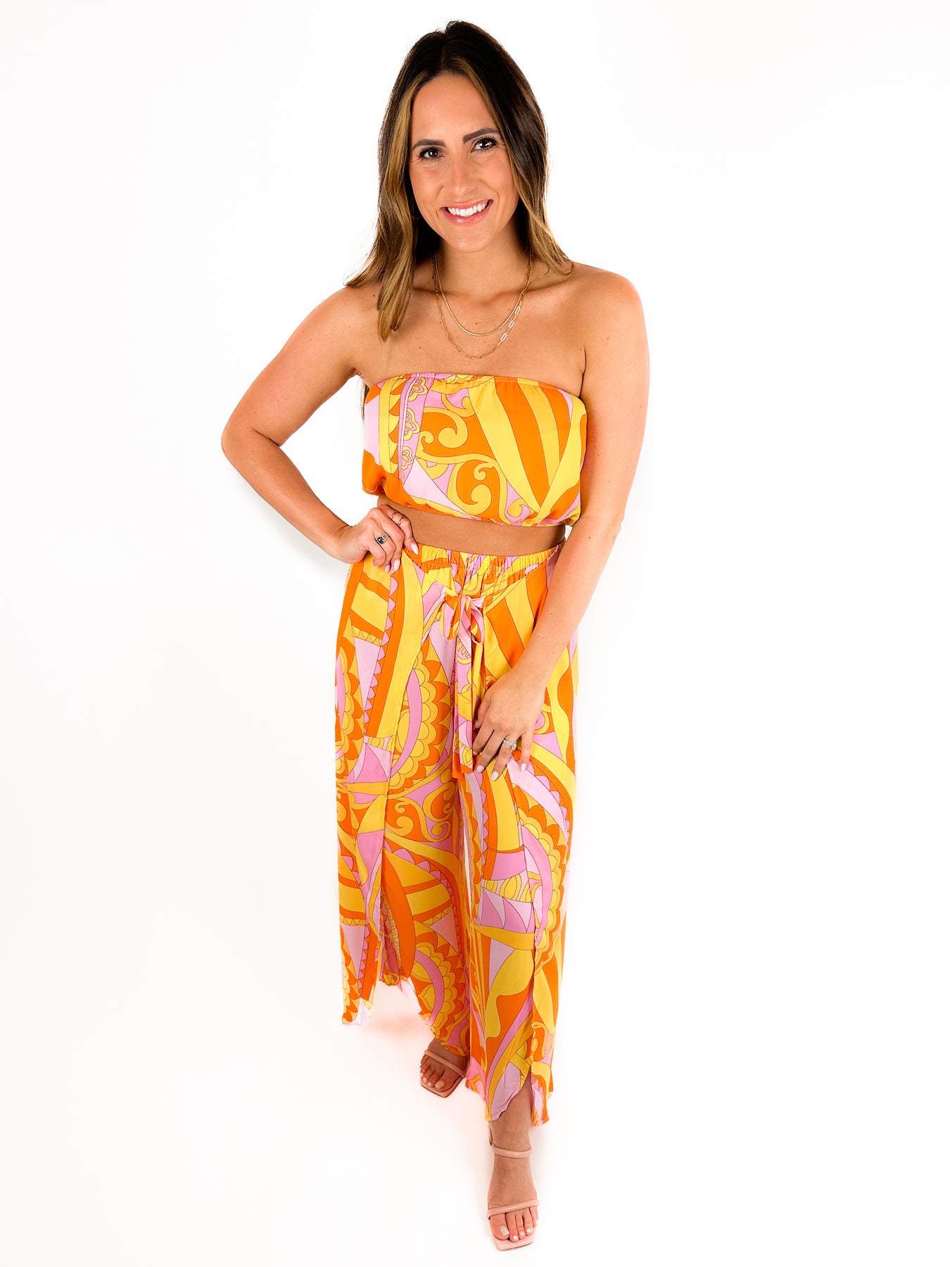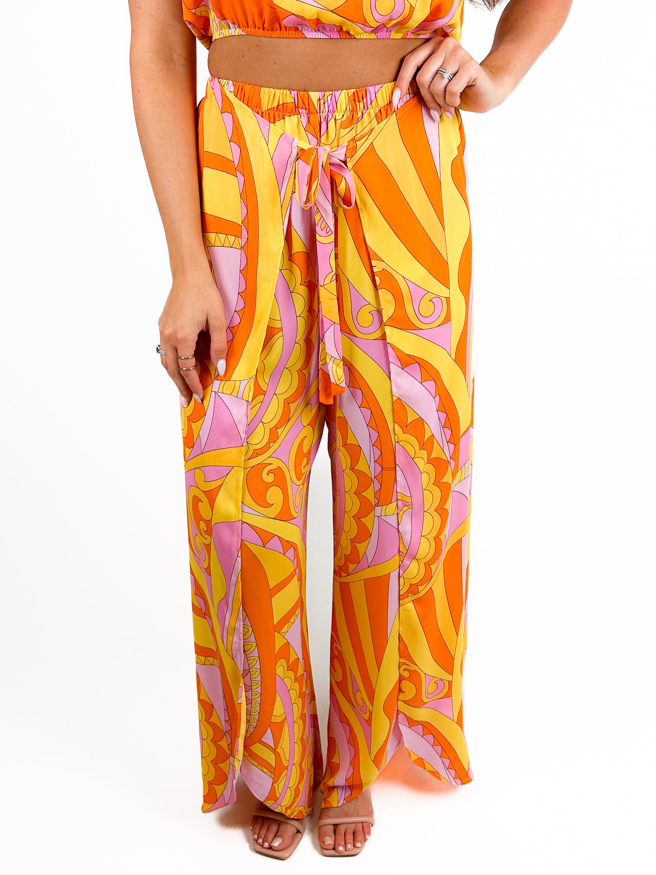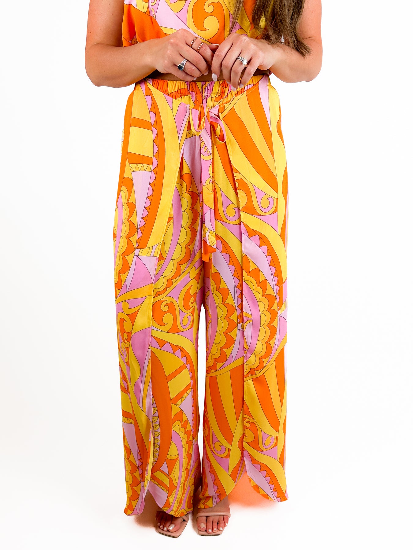 Wow, wow, wow. Aren't these pants fabulous? Done in this bright, fun print, these pants have a flowy front that gives way to show off your legs. The have an elastic waistband and tie.