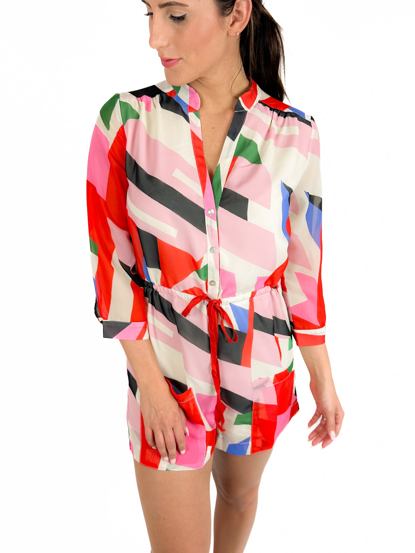 Love a romper? You will love this one. Done in a geometric print fabric, this romper has a mandarin collar, a drawstring waist, and front pockets. It is V-neck, with 3/4 length sleeves, and lined shorts.