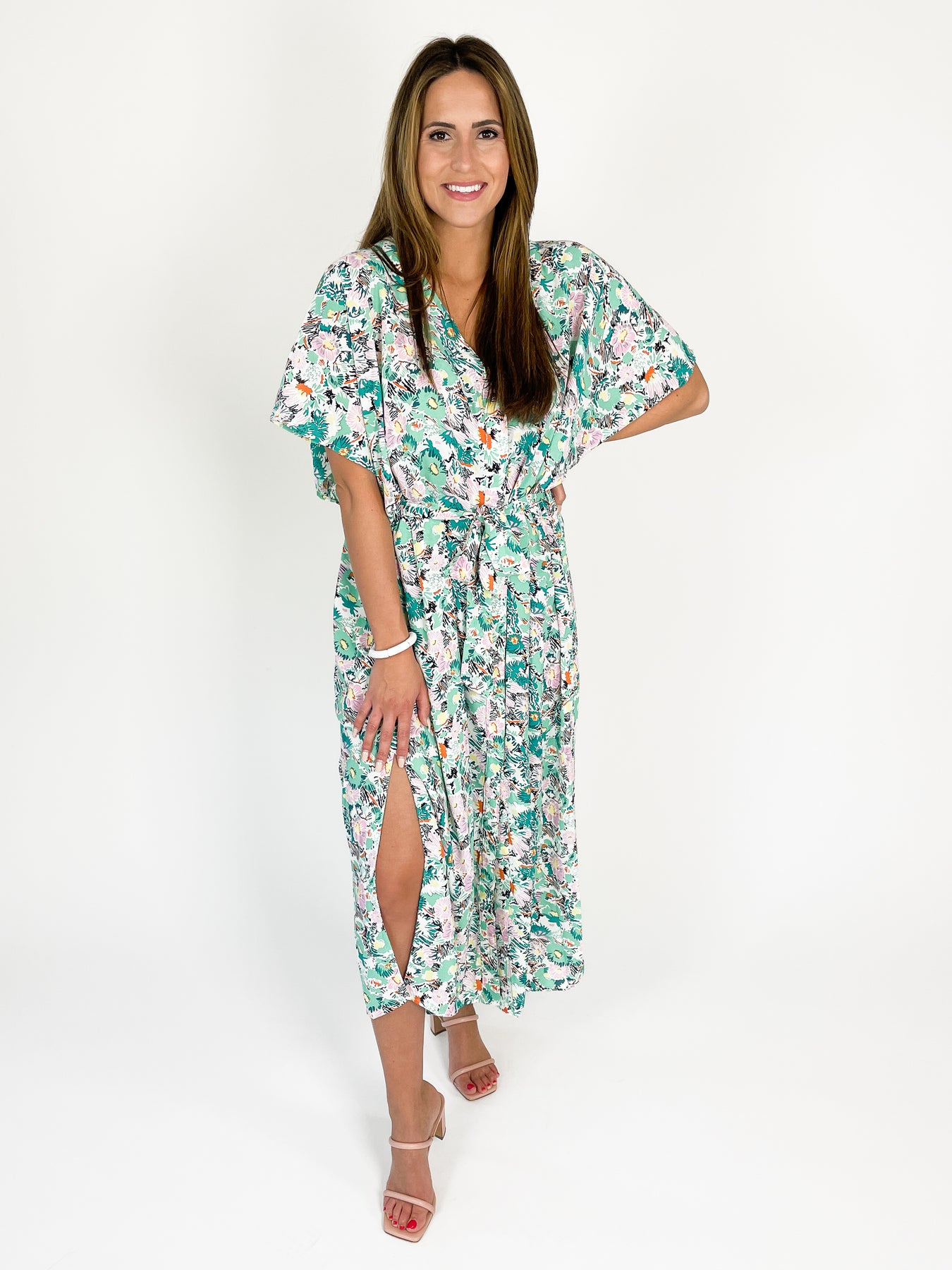Everything from the print to the fabric will make you love this dress. It's a full button-down front with a V neck and tie waist. Wear it tied, untied, or open as a cover up. Dress it up with heels, or dress it down with sneakers. So many ways...you decide. 100% polyester. Model is wearing an extra small.
