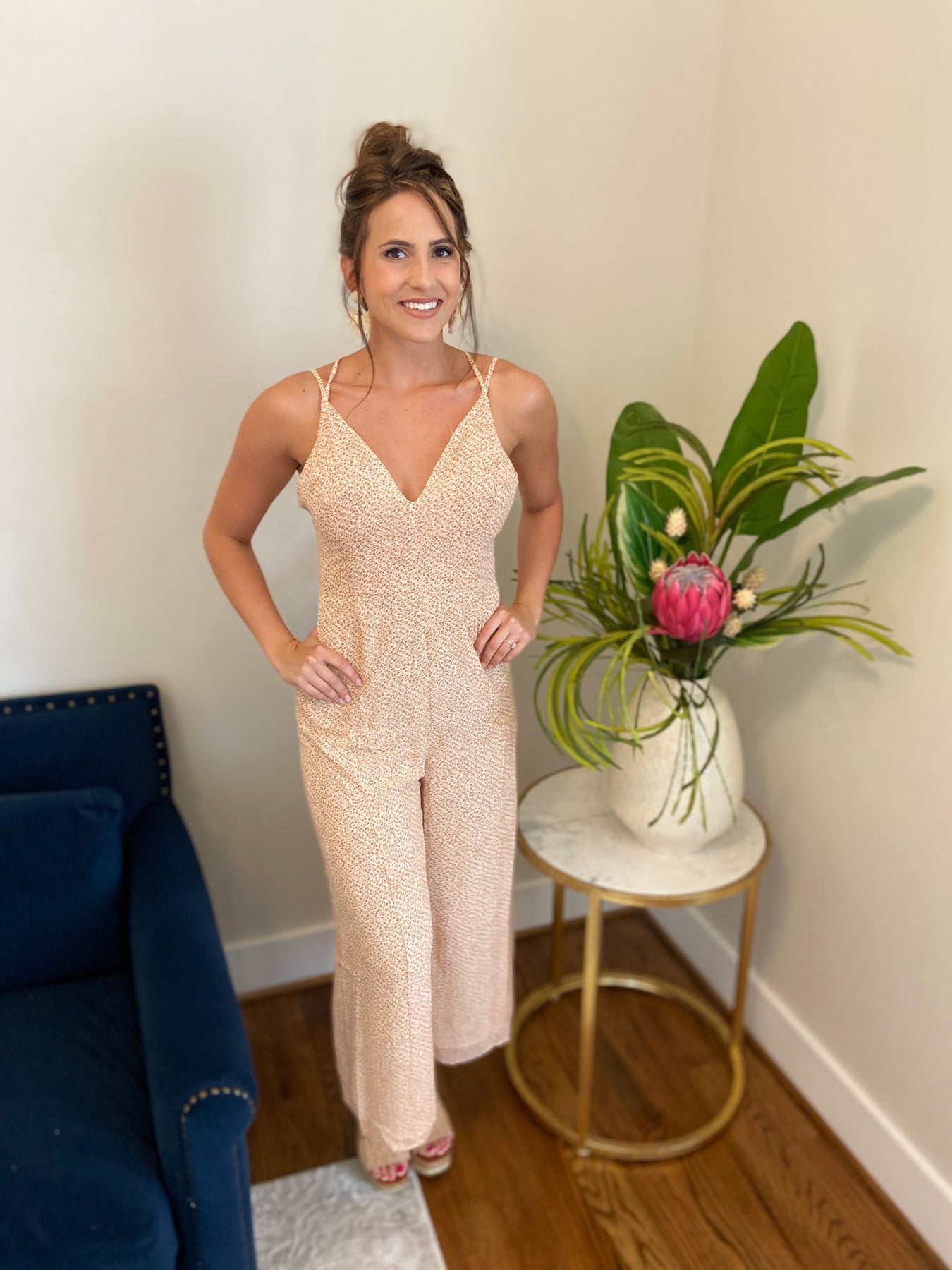 Dinner with friends, weekend getaway, outdoor wedding...the possibilities are endless. Jumper is fully lined and has adjustable straps for a customized fit. Model is wearing a small.