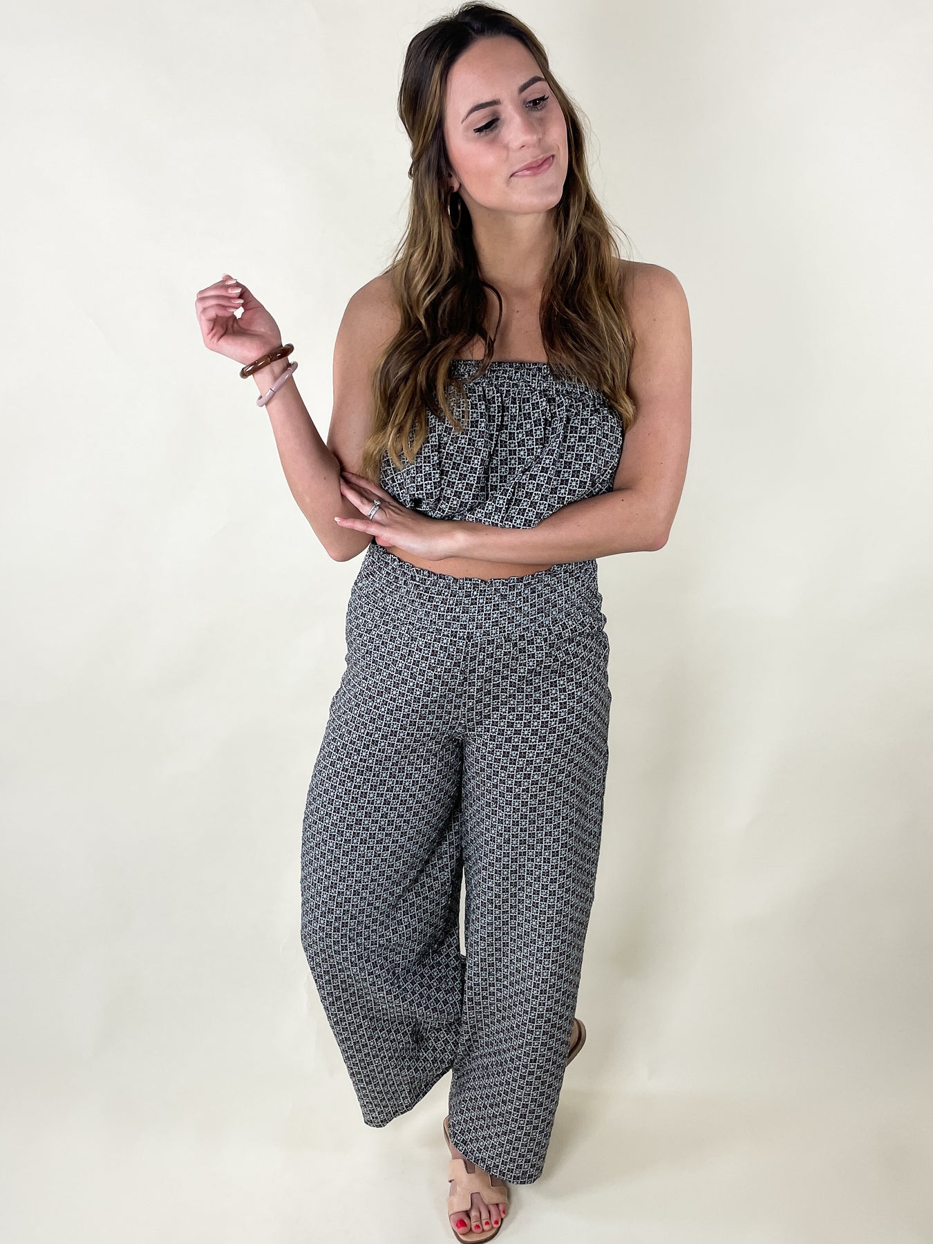 Our popular Super Chill Top is back. This time in a brown and blue print with a slight texture for added pizzaz. This tube top has elastic at the chest and at the waistband. 100% polyester. Pair these with our Super Chill Pants (sold separately) or wear it with your favorite white shorts or jeans. Model is wearing a small.