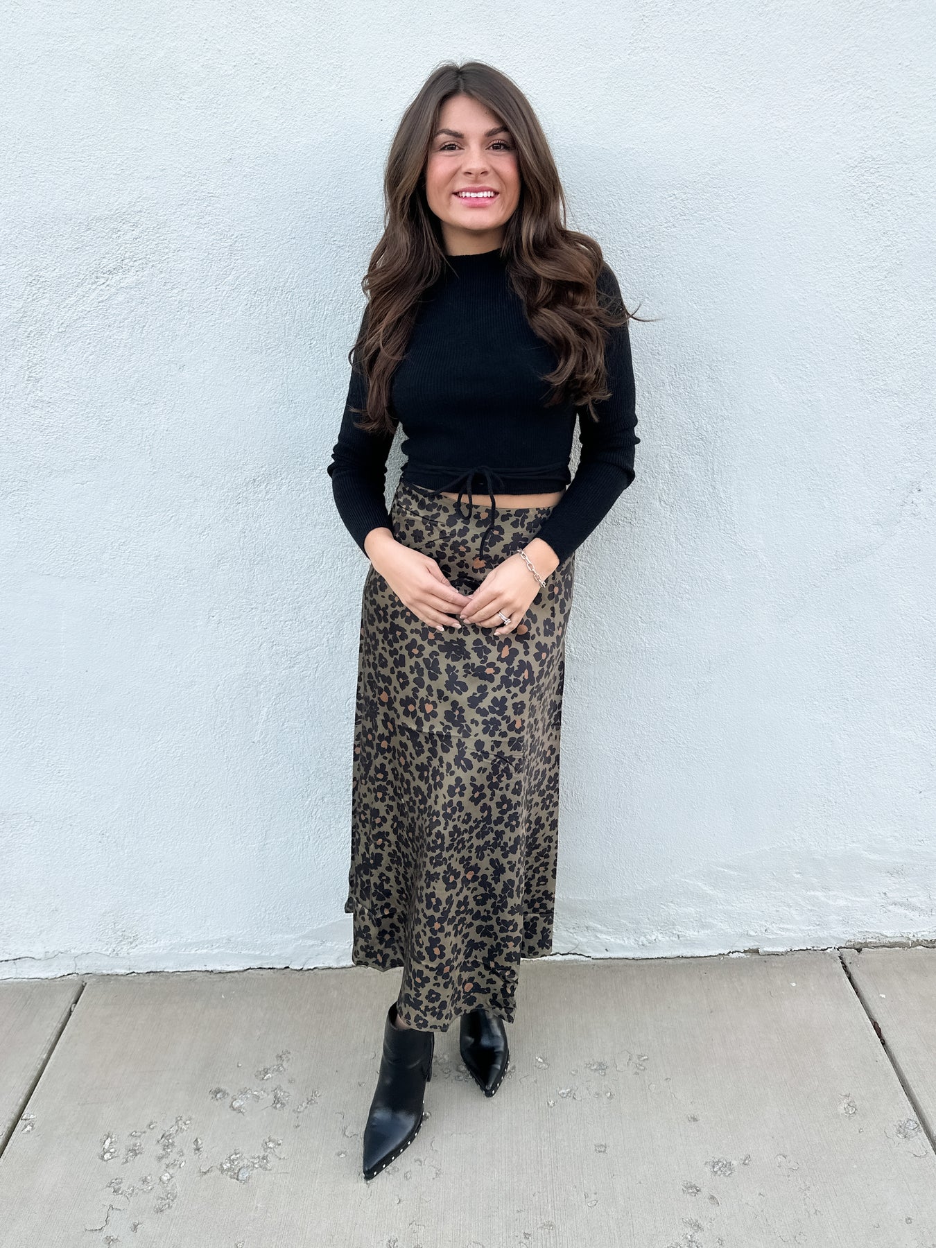 Don't miss out on the long skirt trend. A simple satin, slightly A-lined, in an abstract animal print. Elastic waistband with a side zipper.