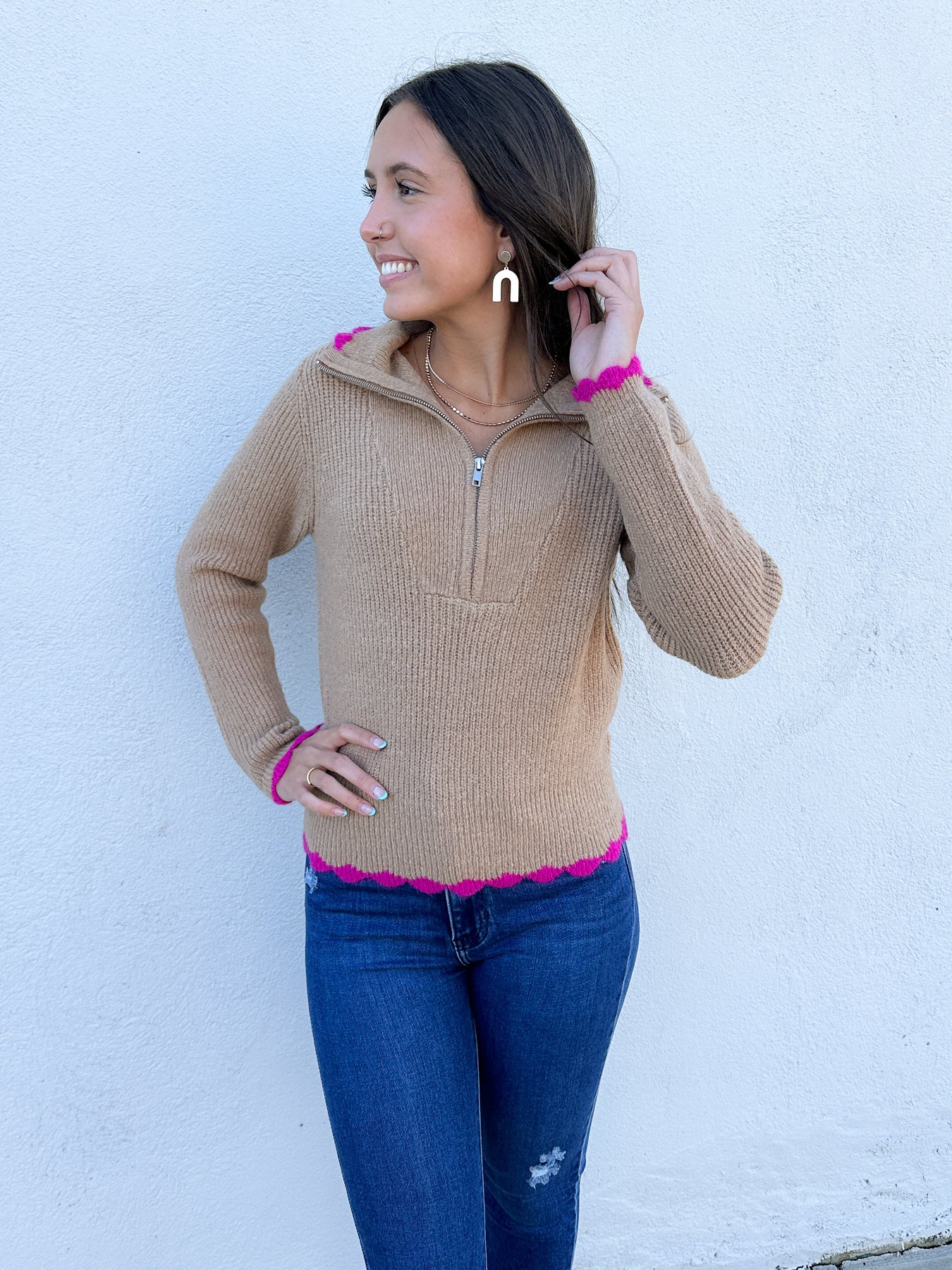Sweaters are always a good idea. We love the color combination of a neutral with a splash of bright. This sweater is a 1/2 zip neck with a fold over collar. The cuffs, hem, and collar are all a scalloped knit.