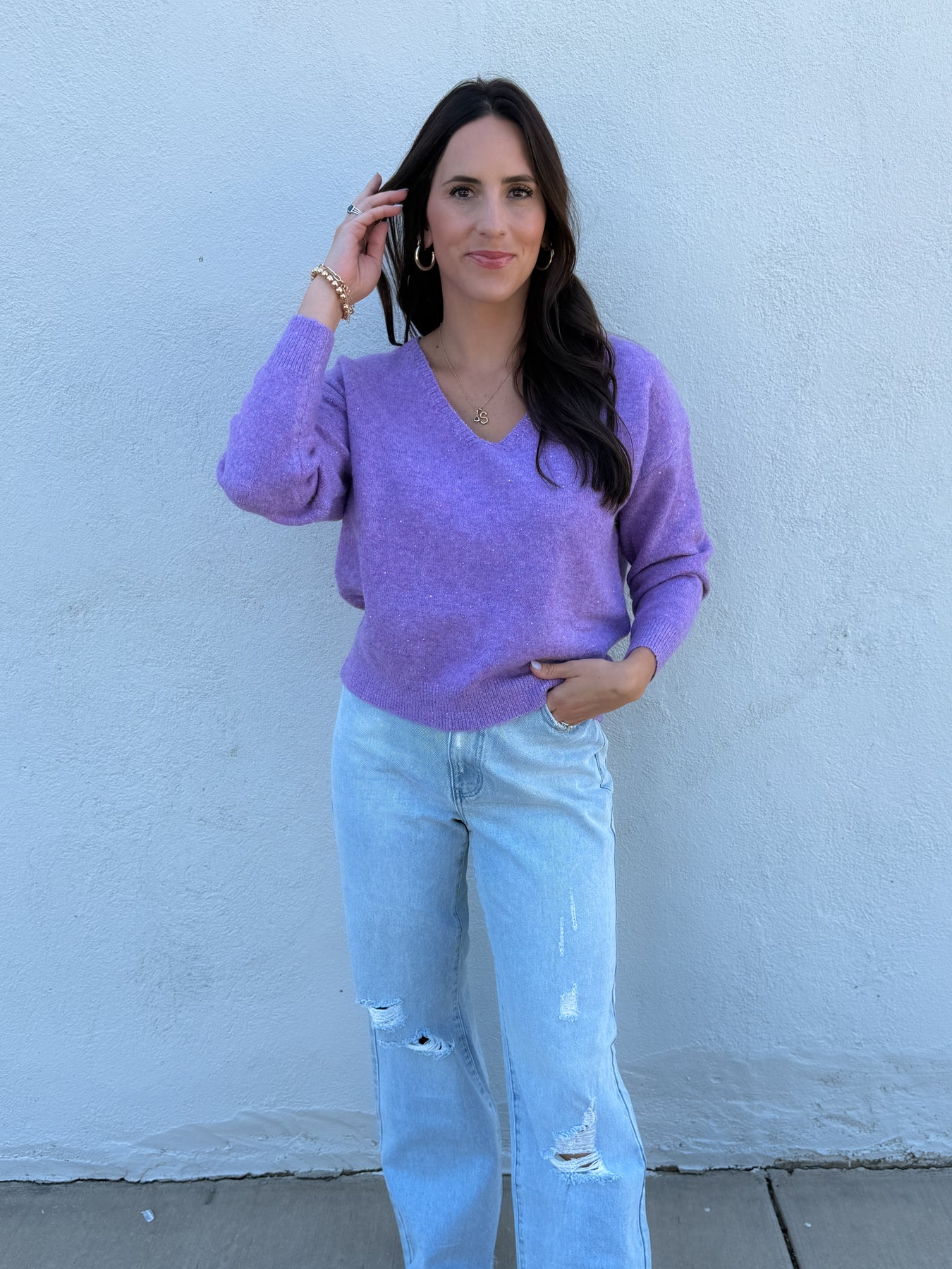 Don't let your sweater collection be boring. Add a pop of color with this purple V-neck. For a little extra pizzaz, there is iridescent sparkle throughout the sweater.