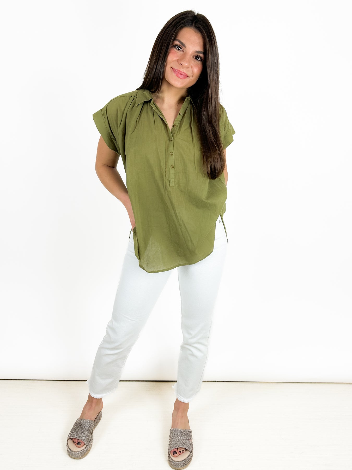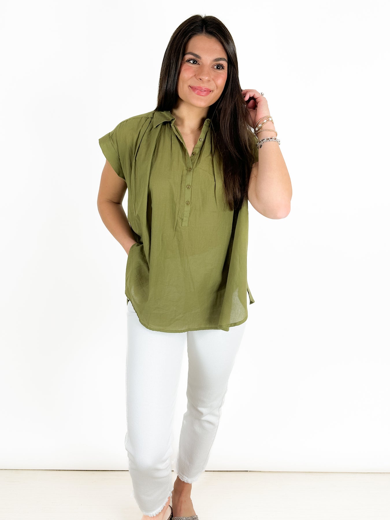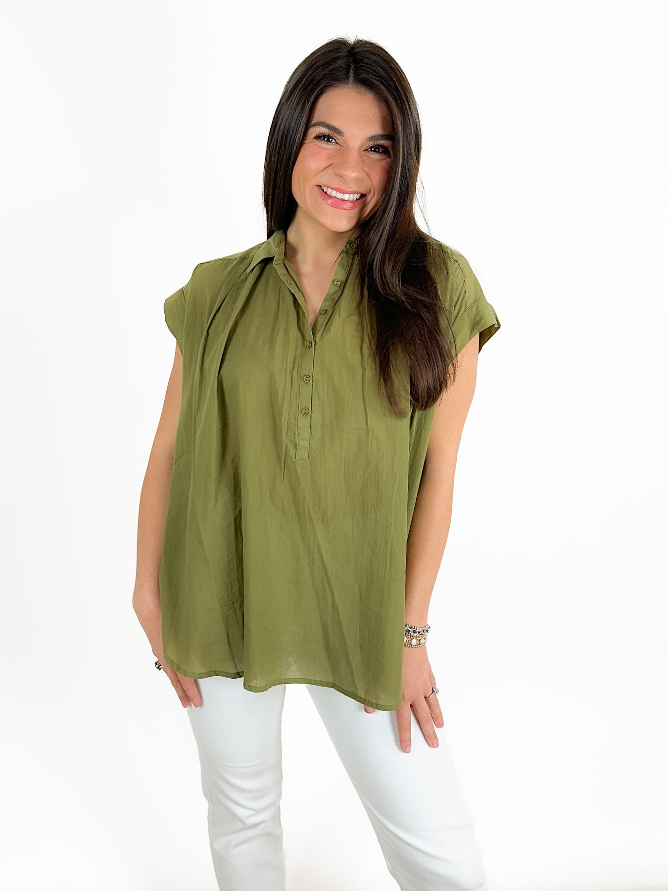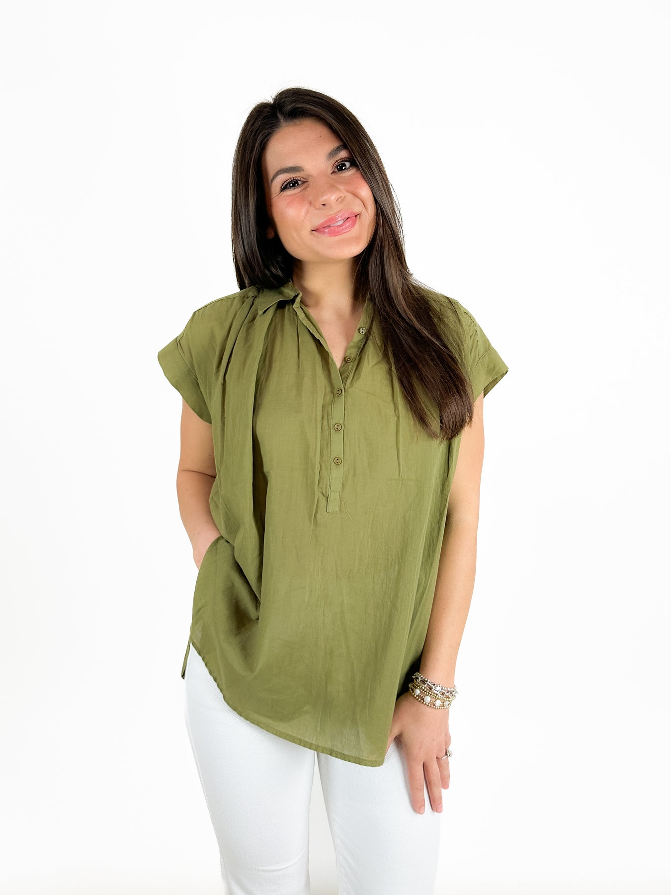 Super cute and short sleeve top done in a neutral olive fabric. This top is a partial button down, with a collar and pleated collarbone. This body style is flowy and feminine.