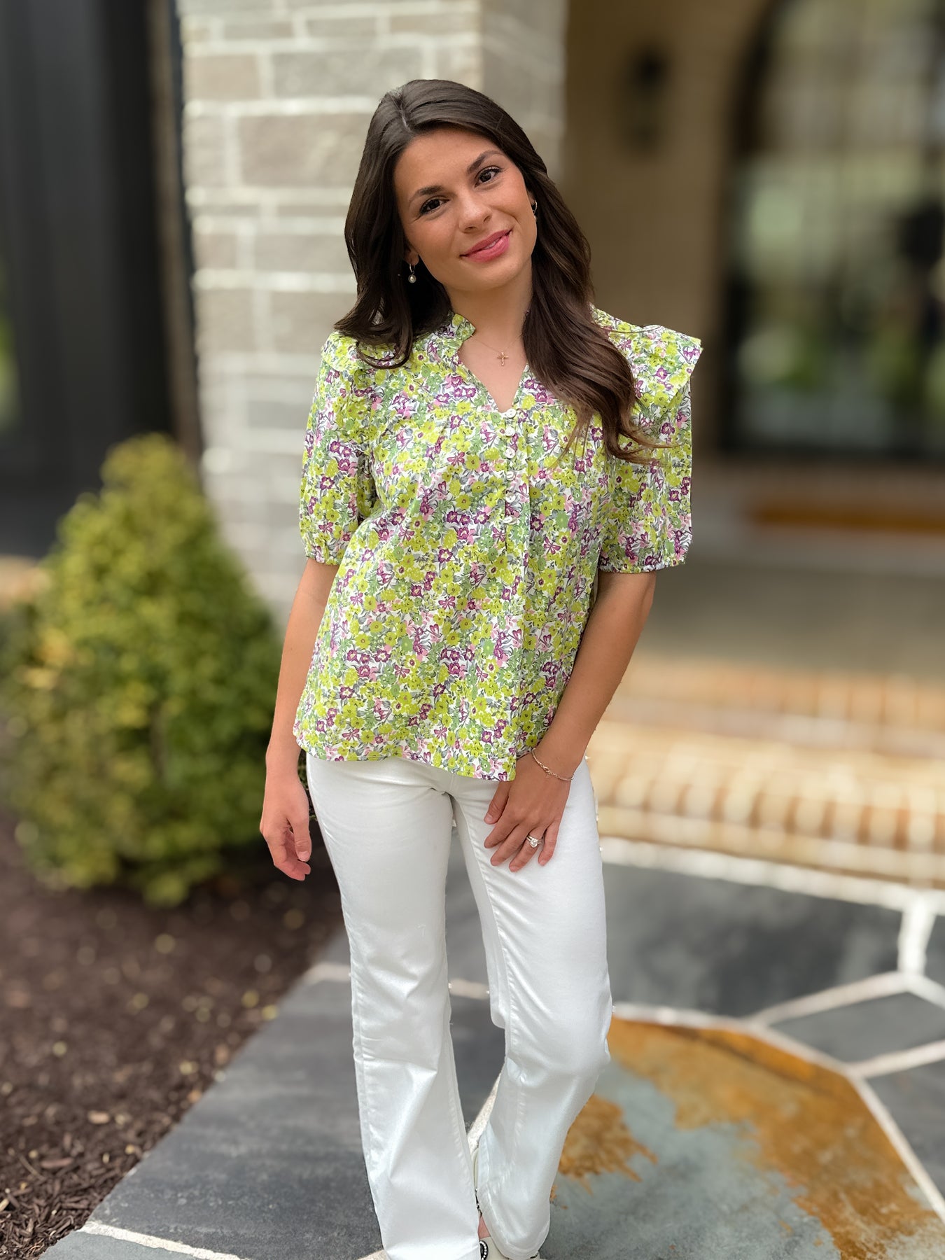 Cutest little top alert. Half button with a ruffled collar, this short sleeve top has elastic at the arms and a straight fit.