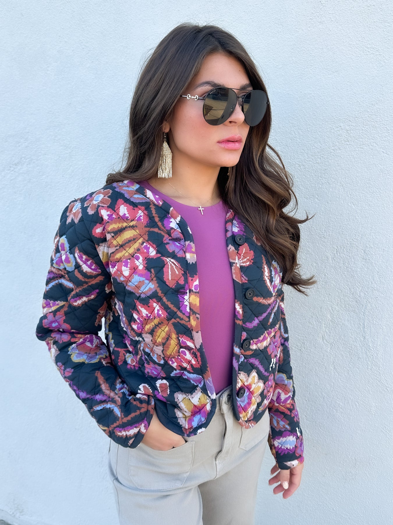 Did you know that quilted jackets were a season must have? You will love everything about this one. It is collarless, has a button front, and a length that sits near the waist. The pattern is fun and can be worn with many different bottoms.