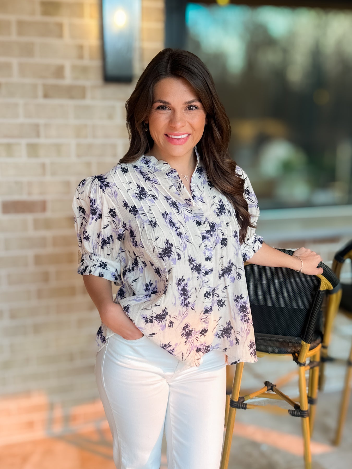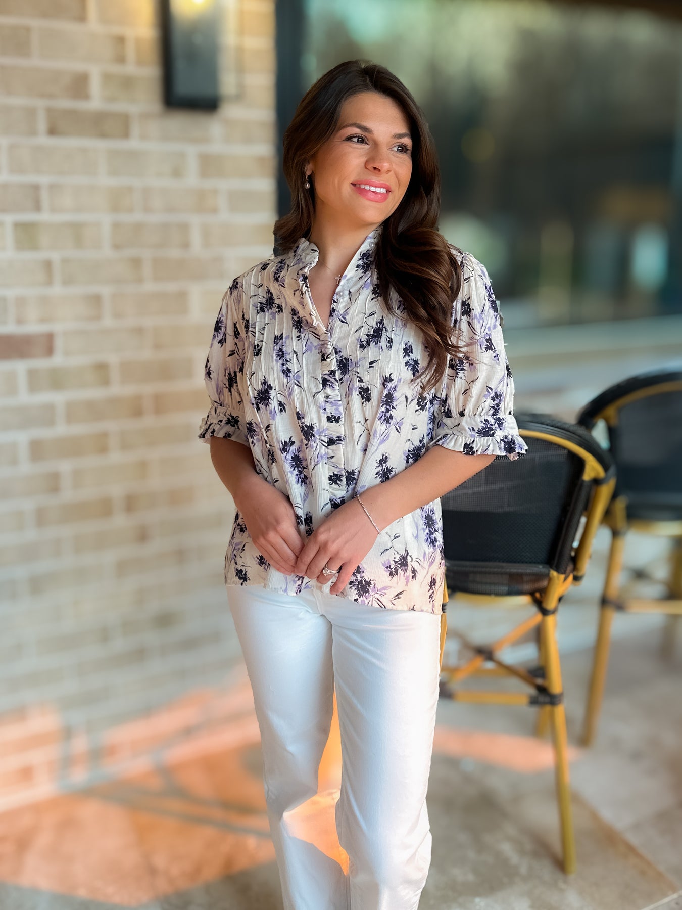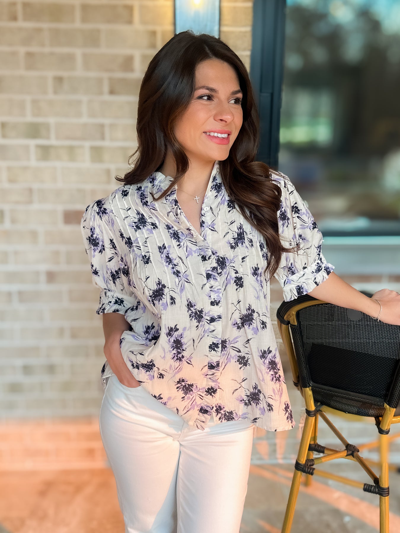 Need a blouse? Look no further. Our Bishop + Young blouses never disappoint. Button-down, short slight puff sleeve, with stitching detail on the bodice. This great floral print is a winner.