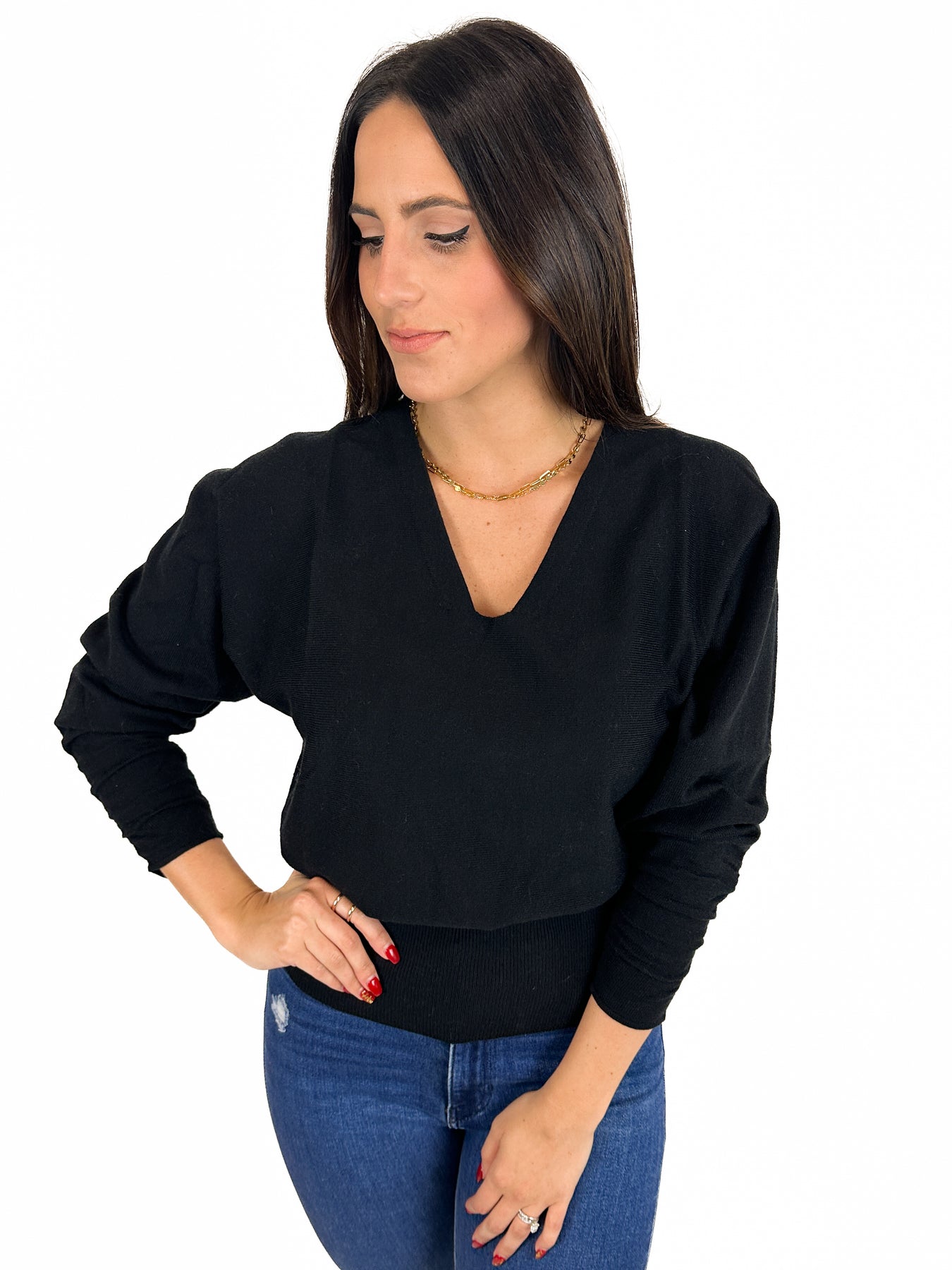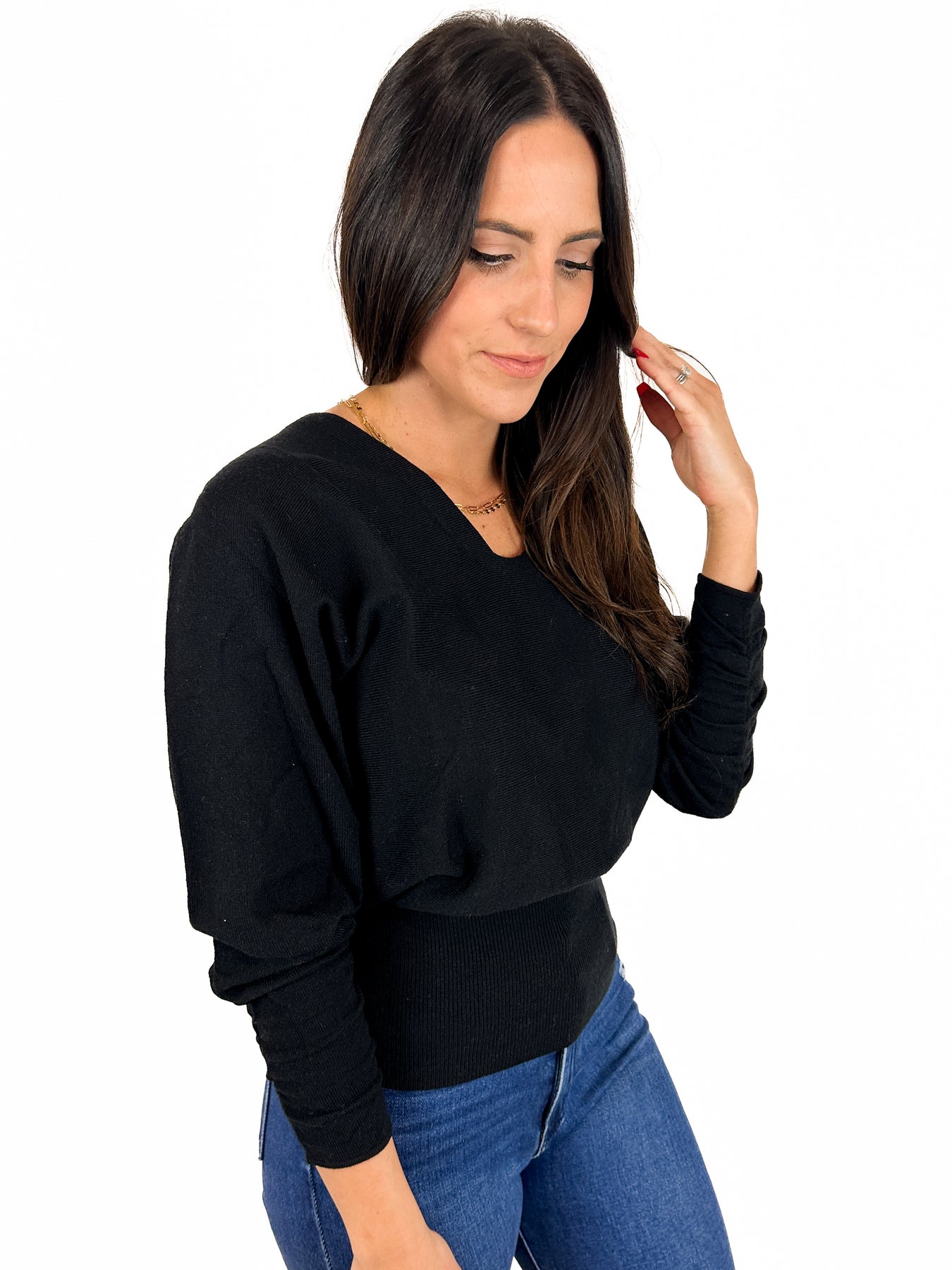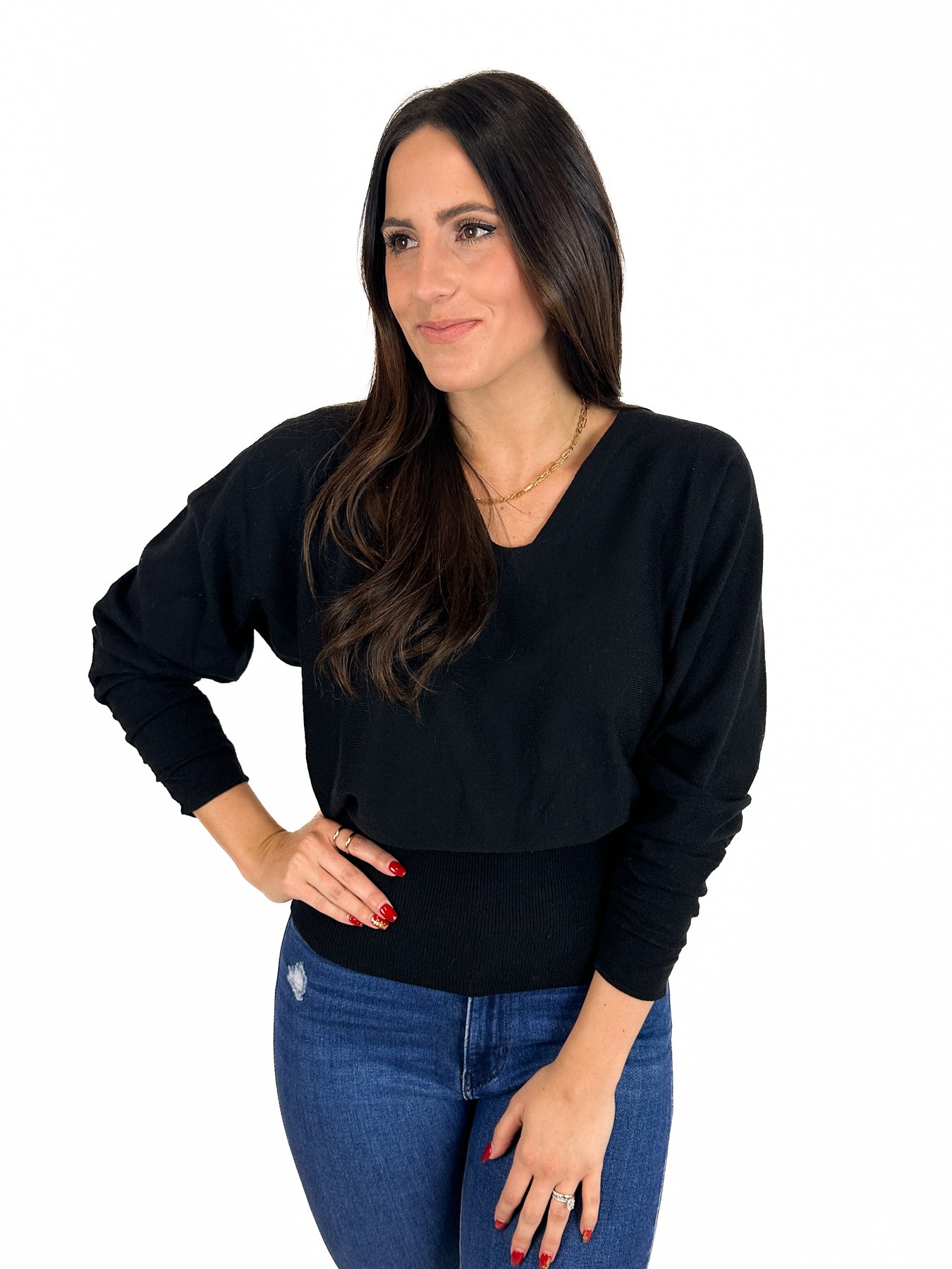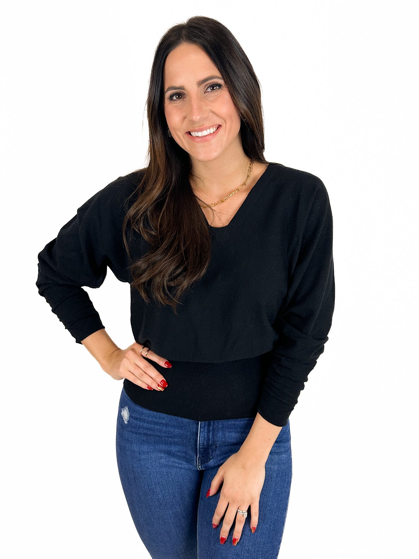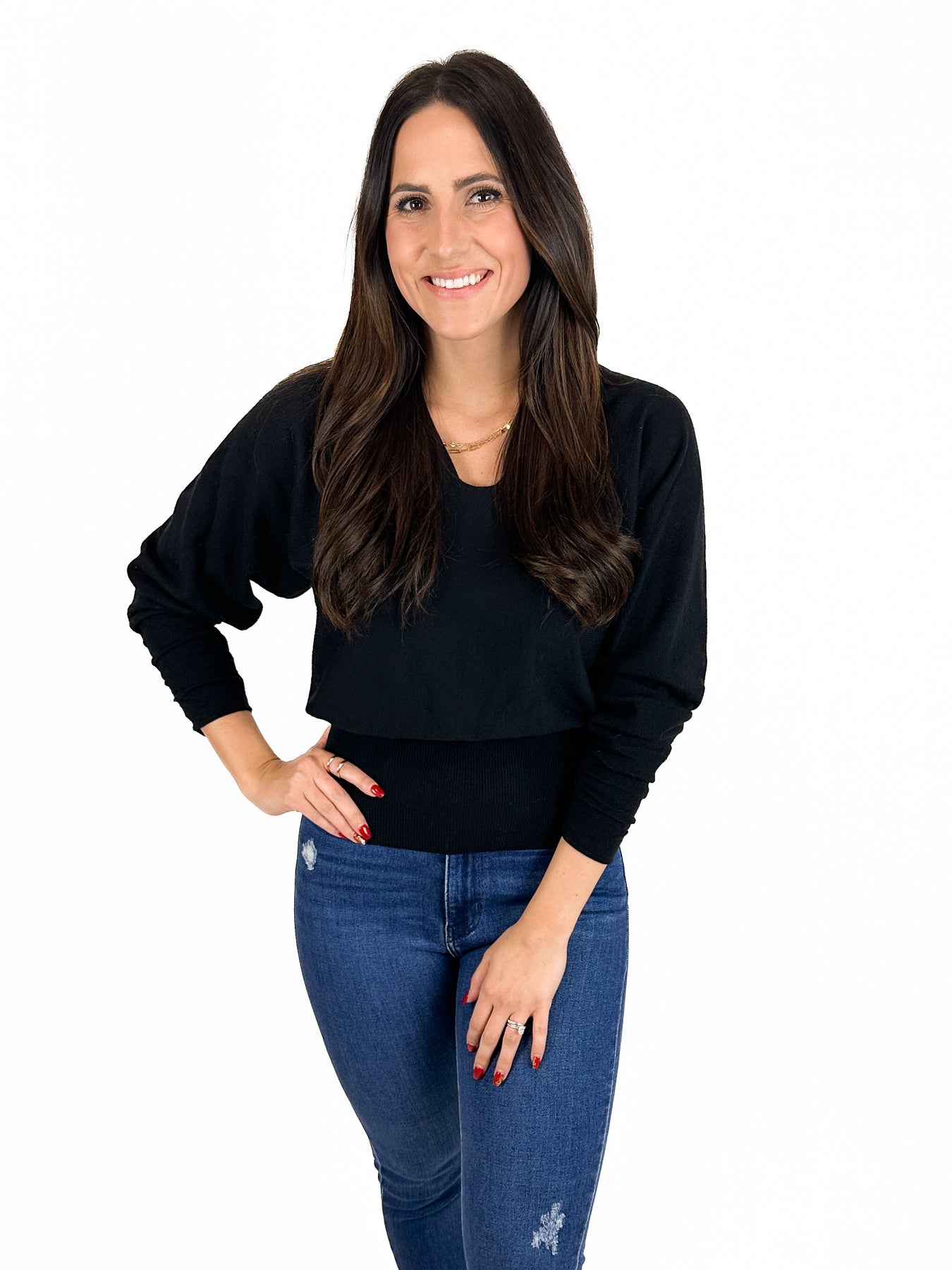 Looking for a basic black sweater? Here is a good one. Featuring a medium knit, it has a U shape neckline, long sleeves, and a banded waist. It will be your go to basic black for the season.