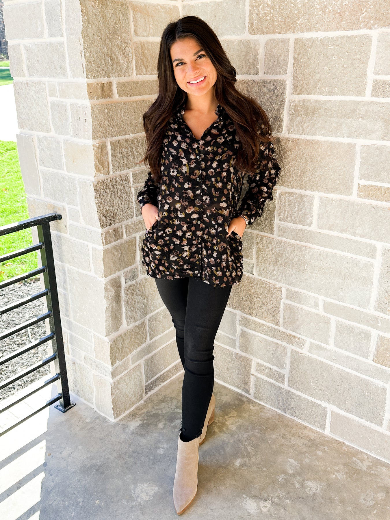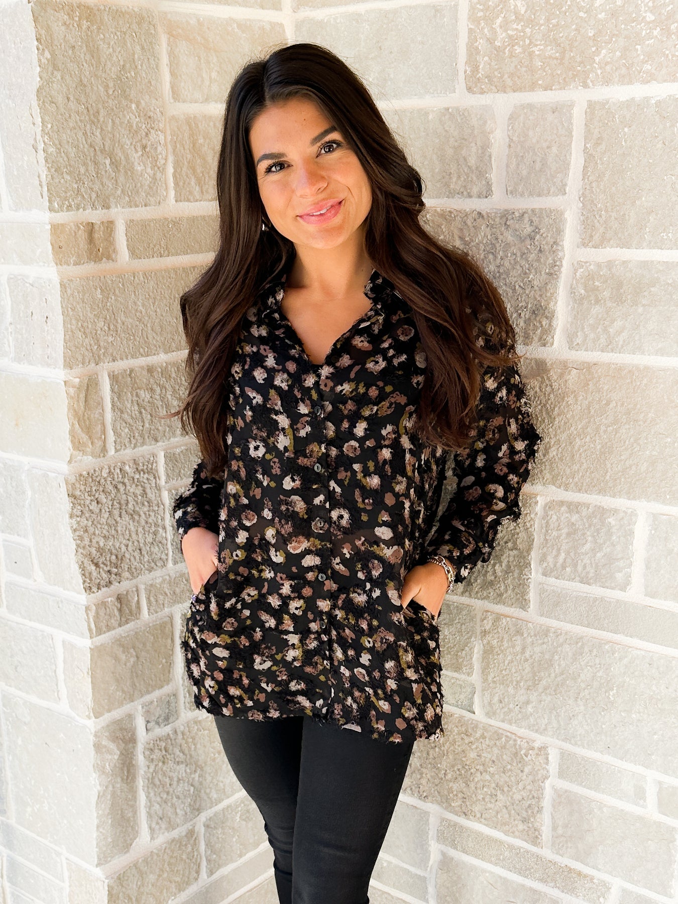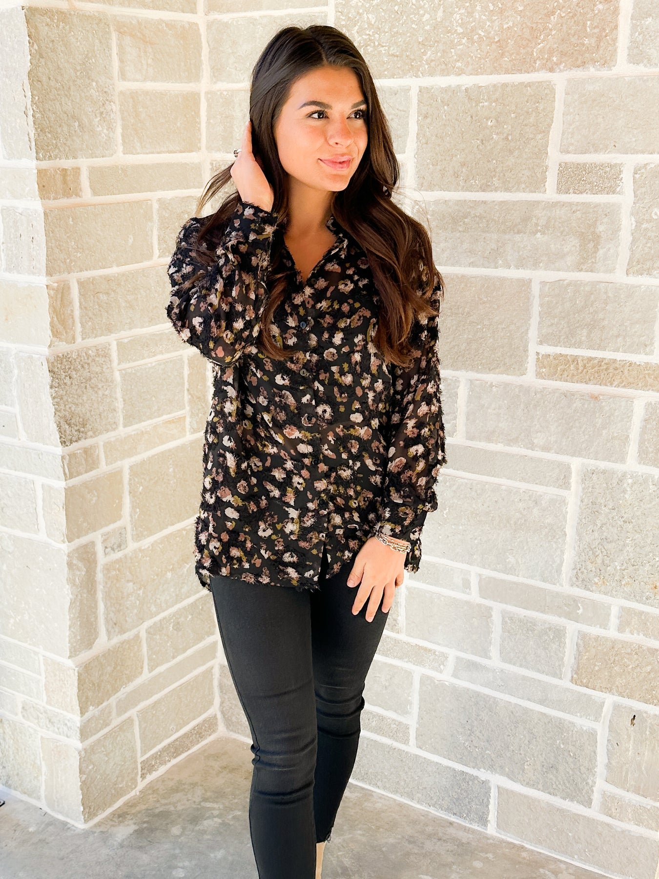One of our favorite basic button-down blouses available in an animal print. Long sleeve, button cuff, and collar are the details of this top. Wear it with your favorite pants or leggings. It's sure to become your favorite go-to blouse.