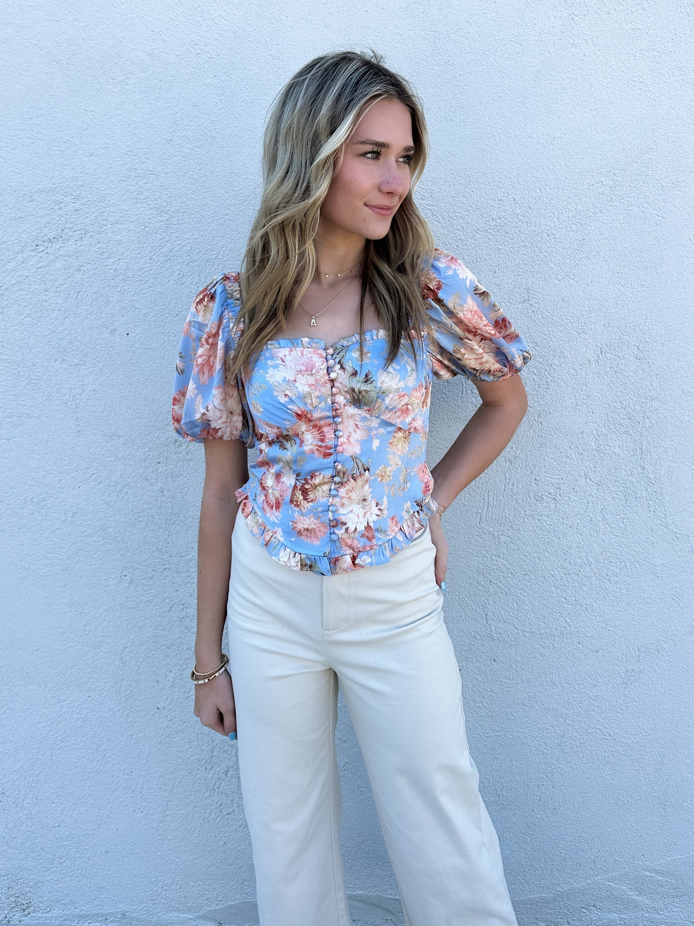 Beautiful corset style top done in a fabulous floral satin fabric. This top has a feminine quality with pastel colors, a slight puff short sleeve, and the button front detail.