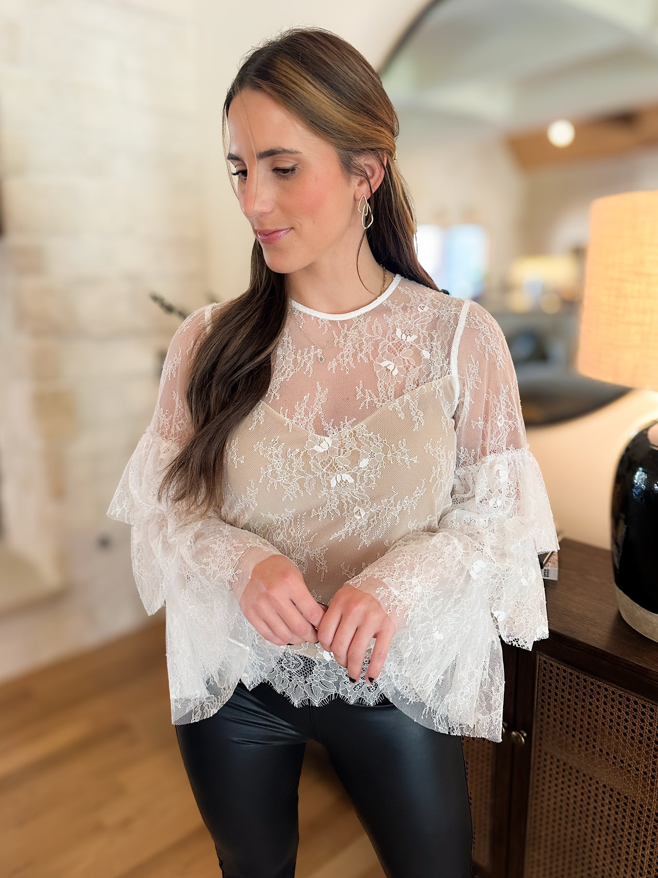 What’s better than lace? Layers of lace. This white top has a nude lining on the bodice and a sheer, tiered ruffled long sleeve. So feminine and beautiful.