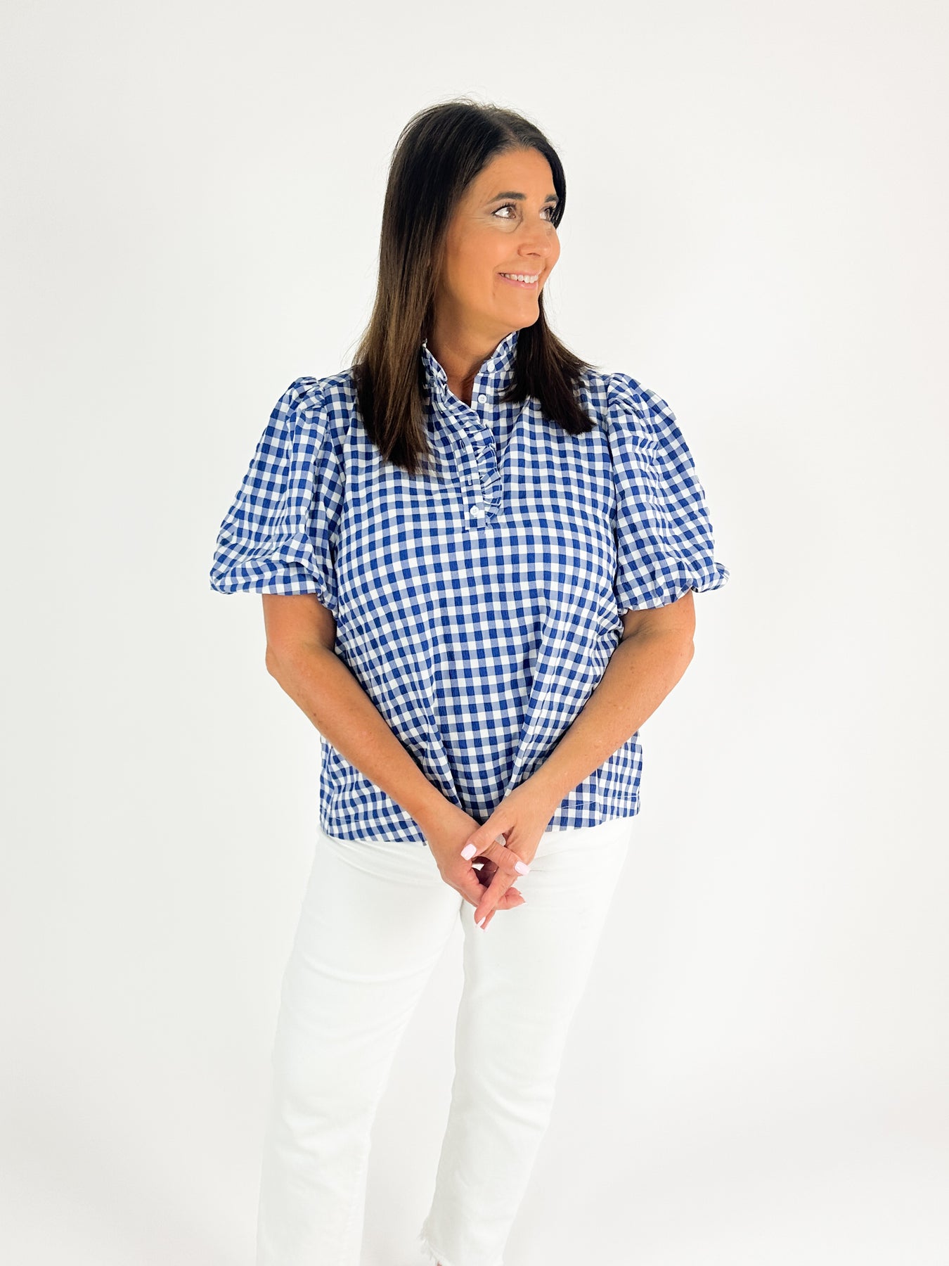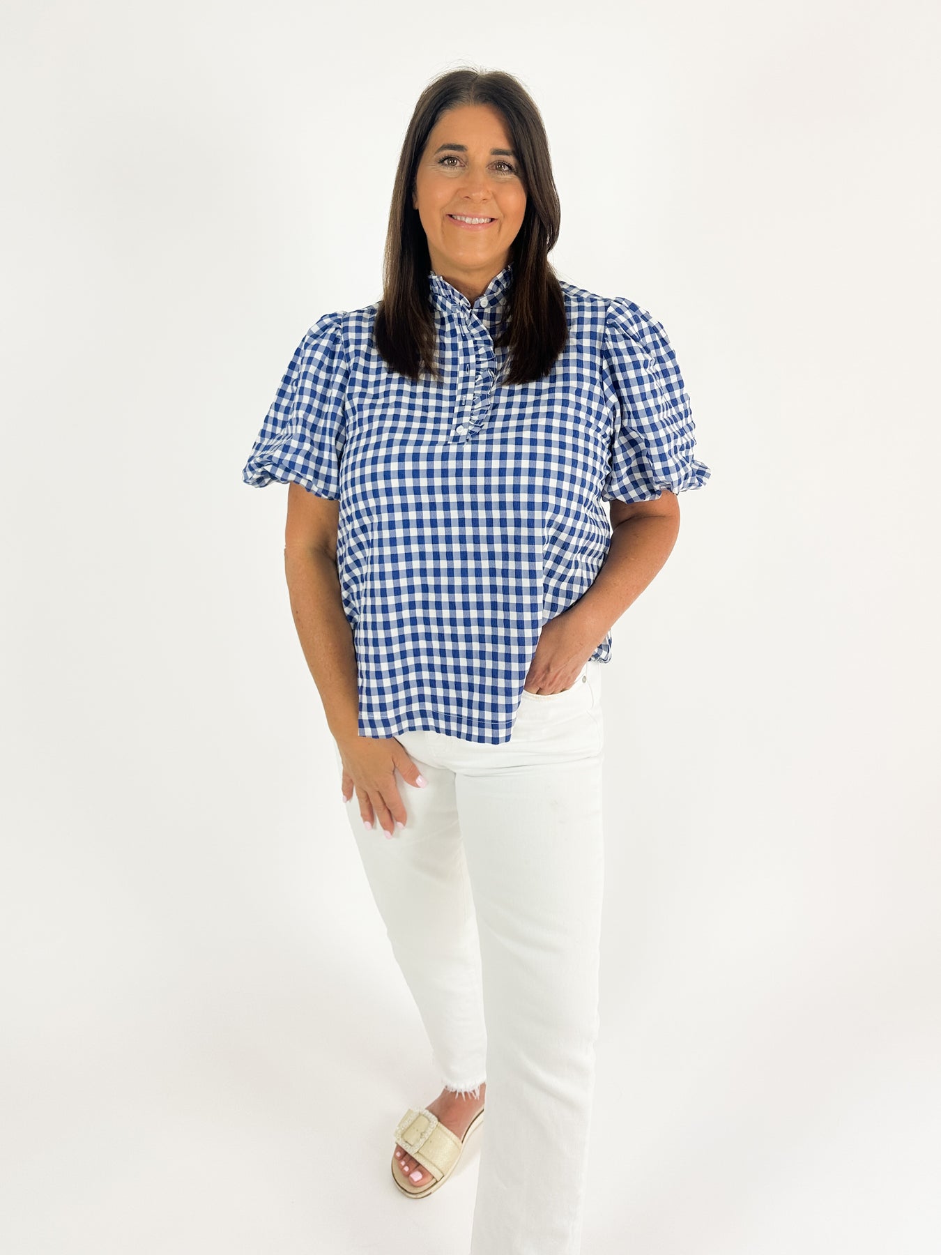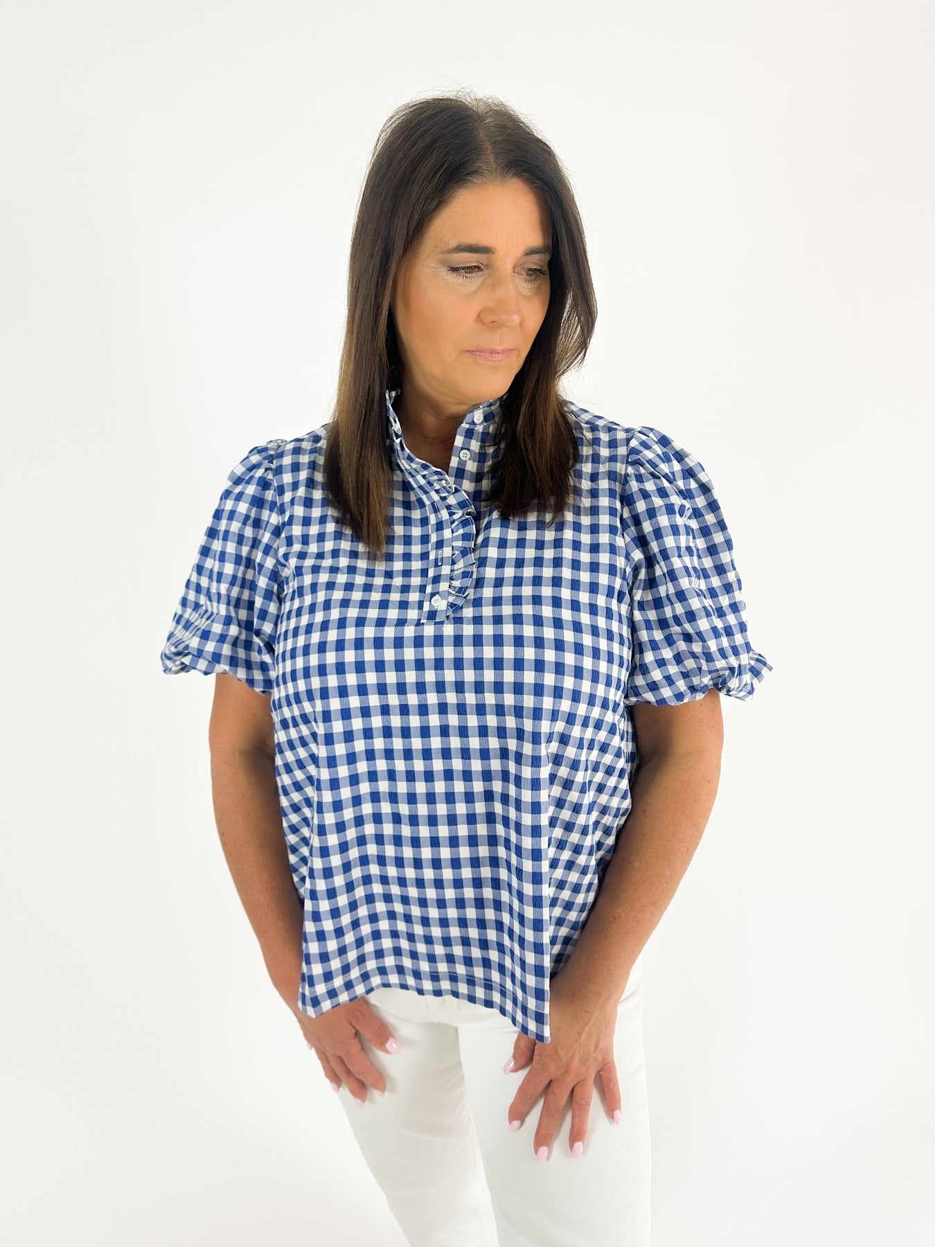 Classic blue and white gingham check. Puff bubble sleeve, with partial button front. The fabric has a slight stretch for a comfortable fit.
