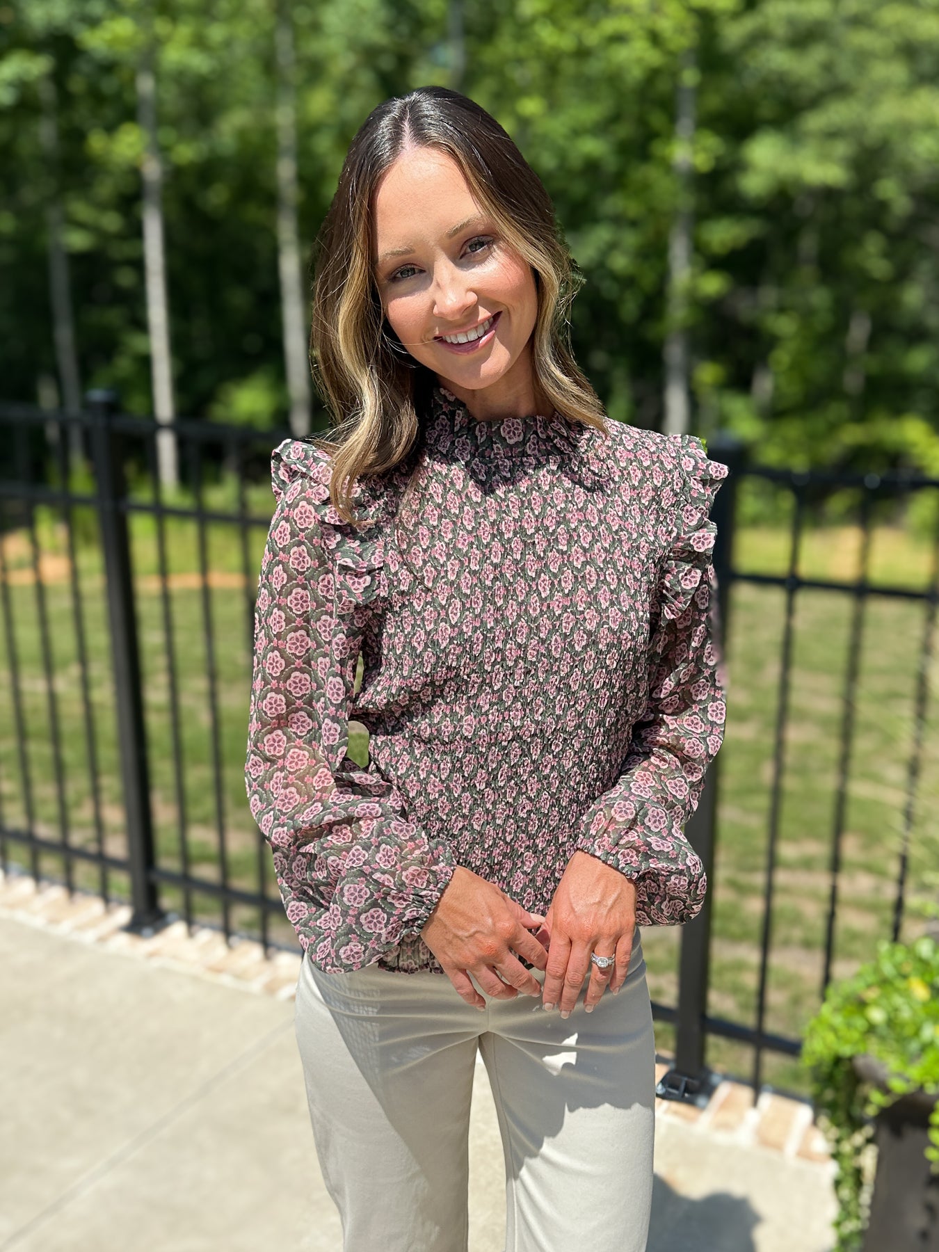 Don't sleep on this fabulous blouse. With a fun print, mock neck, and smocked body, everything about this top is great!