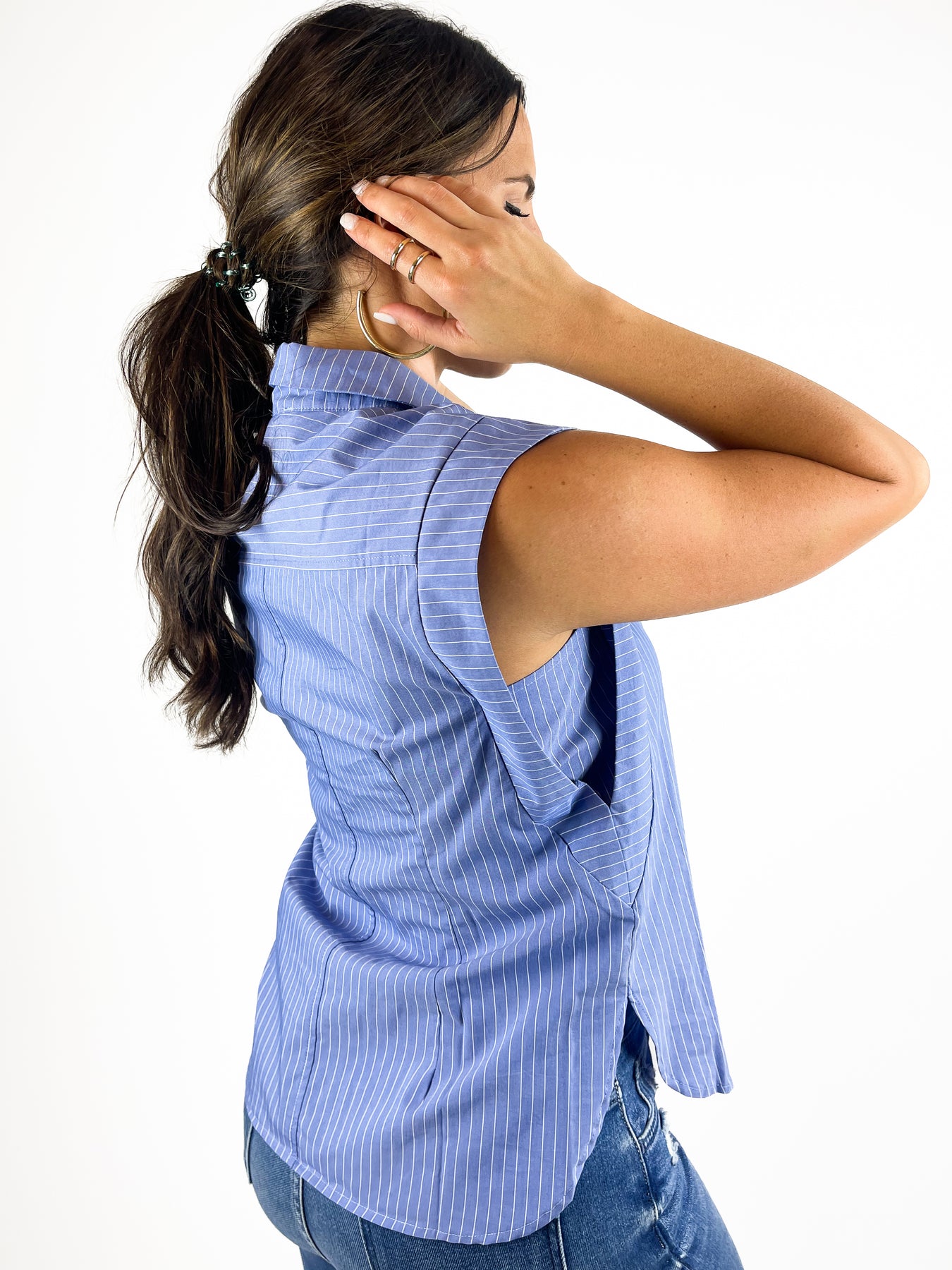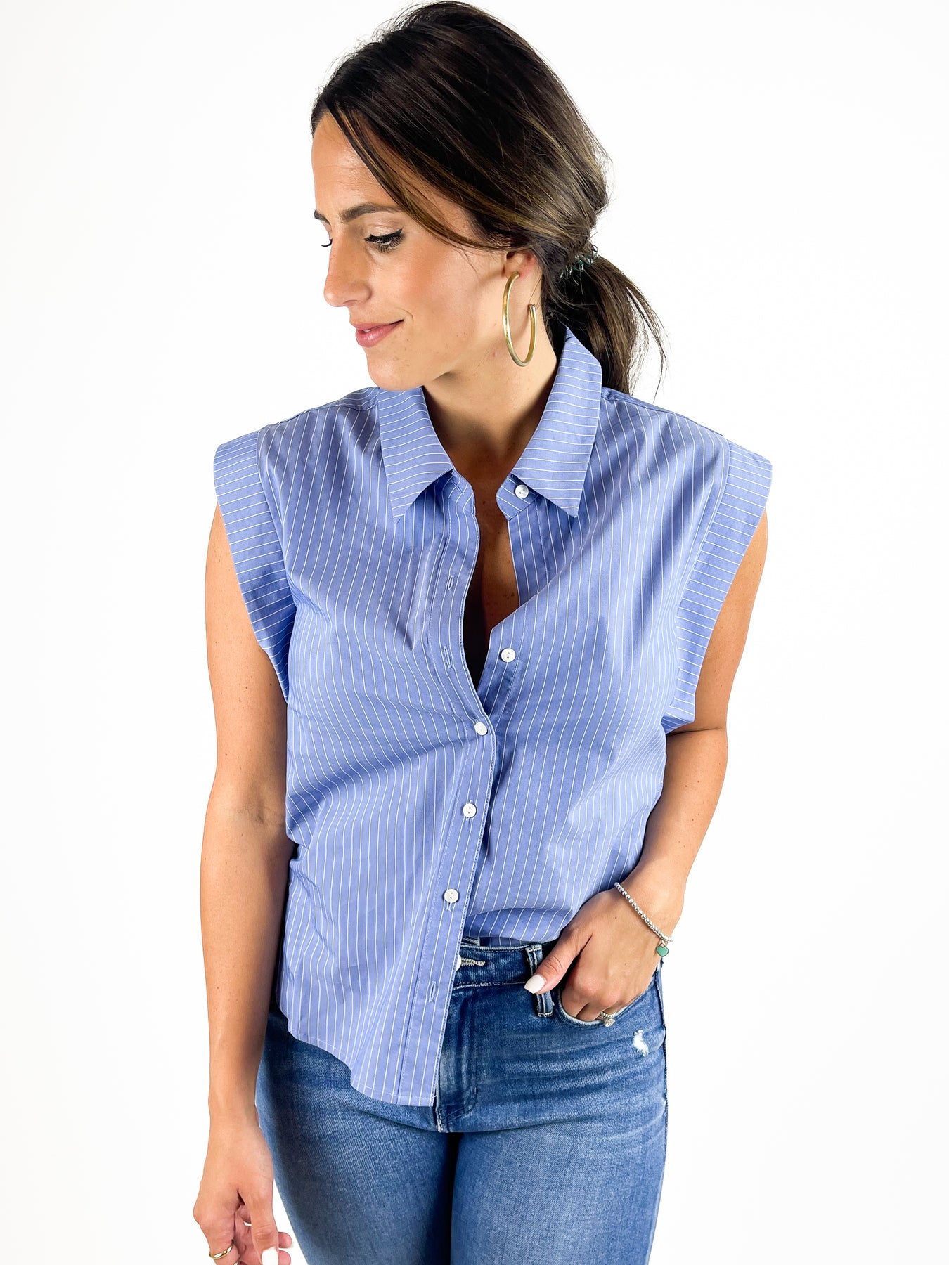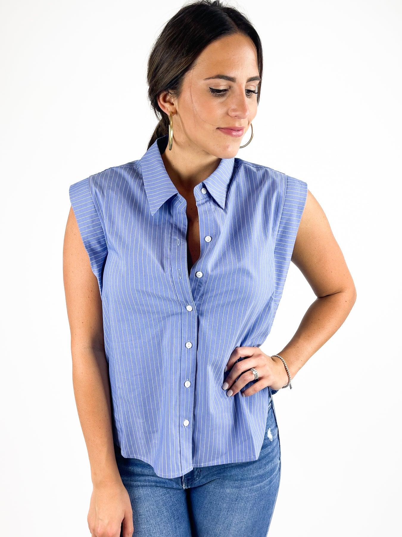 Are looking to add something just a bit different to your closet? Try this top! The style at the shoulder gives a little extra fullness. Mix that with a collared button down front and you come up with great top. Model is wearing a small. 65% cotton 32% polyester 3% spandex.