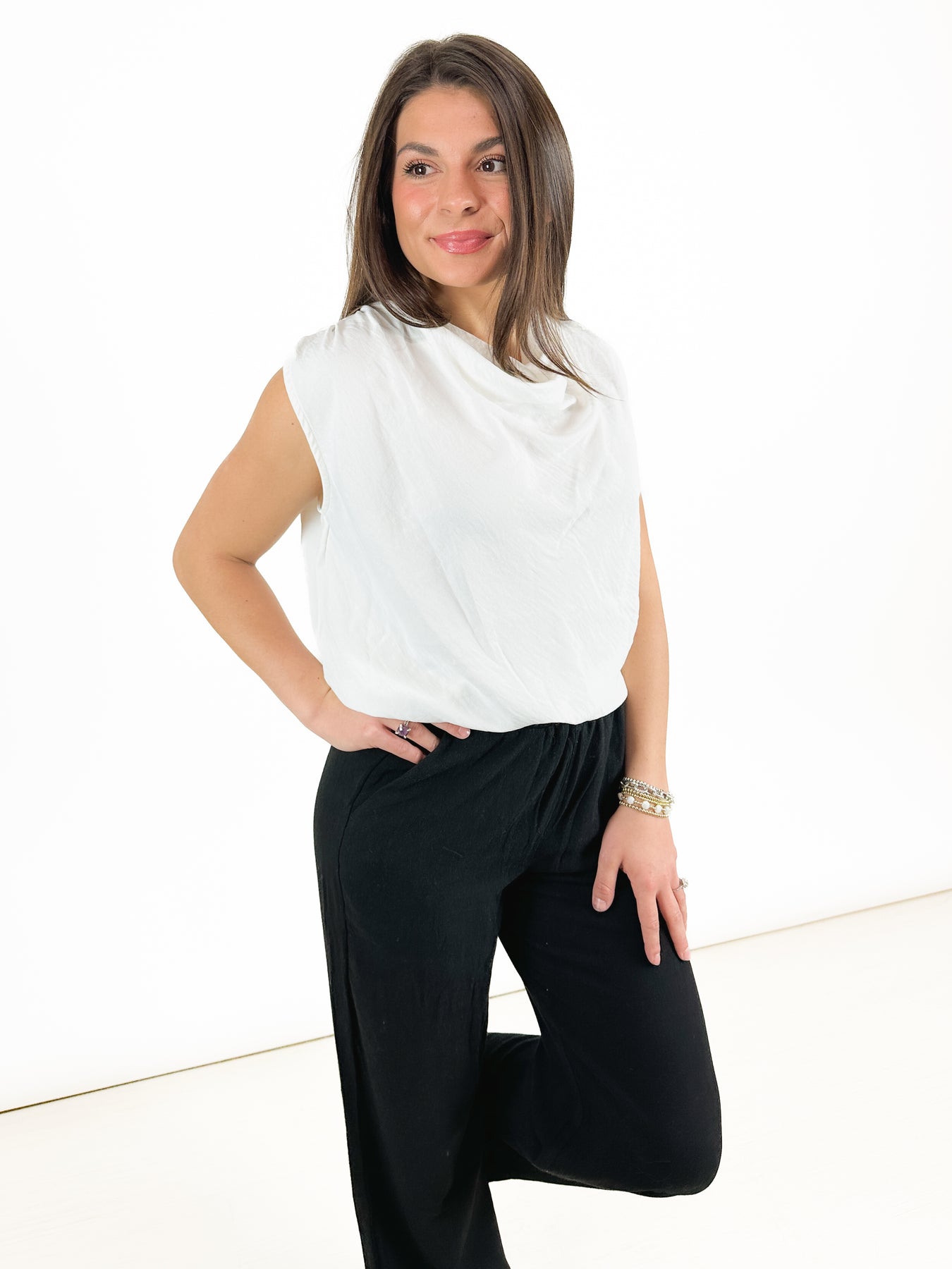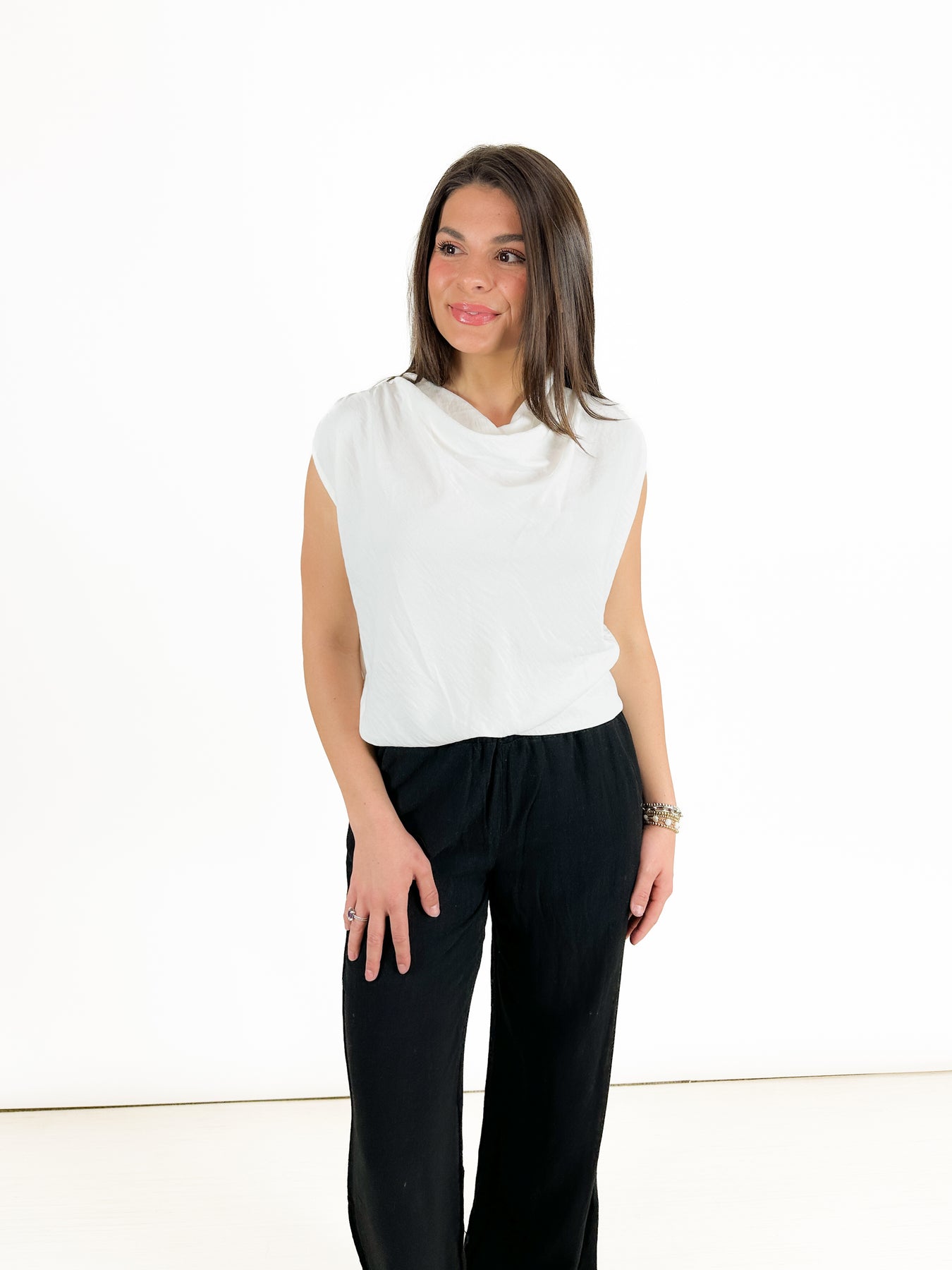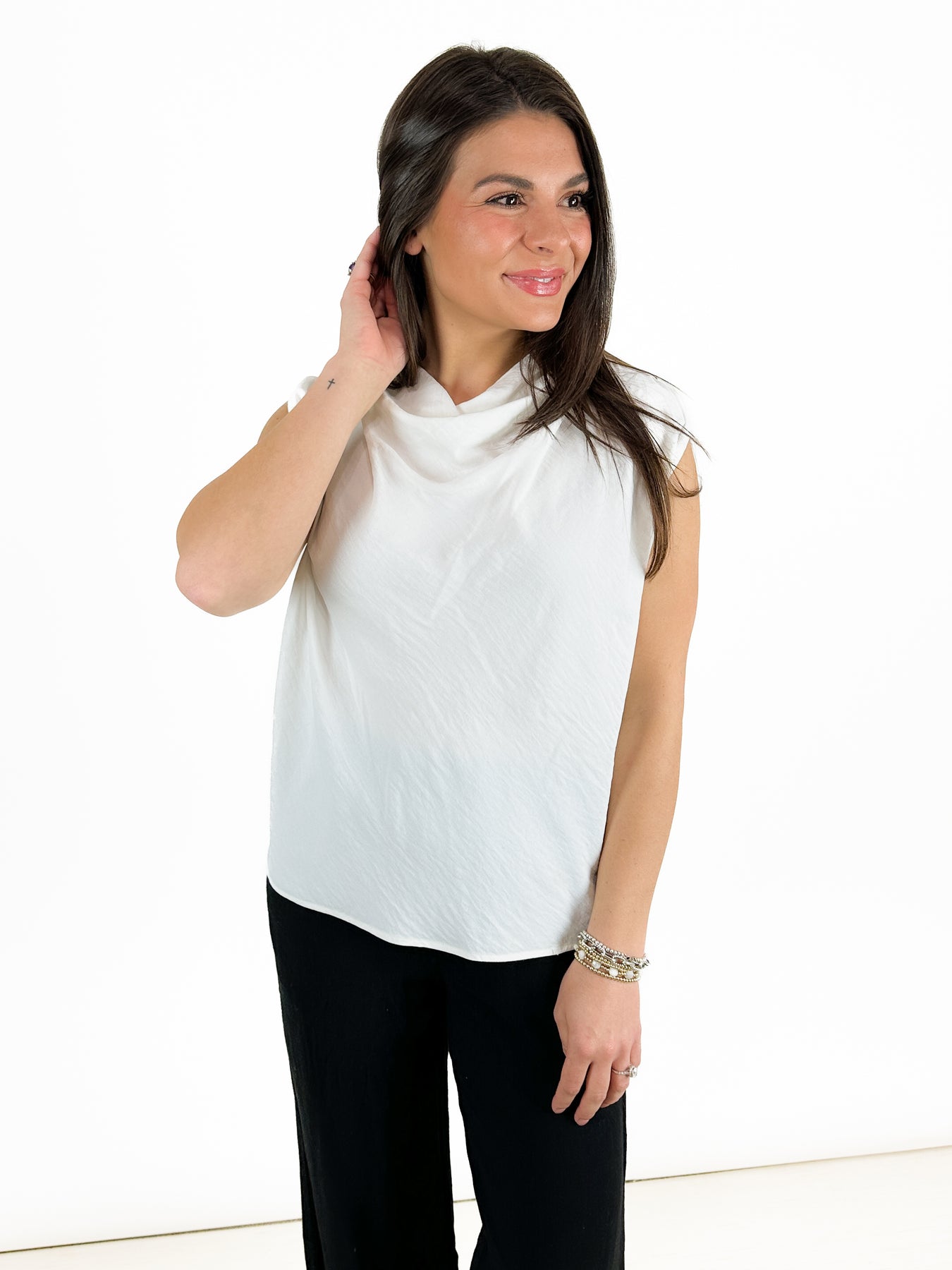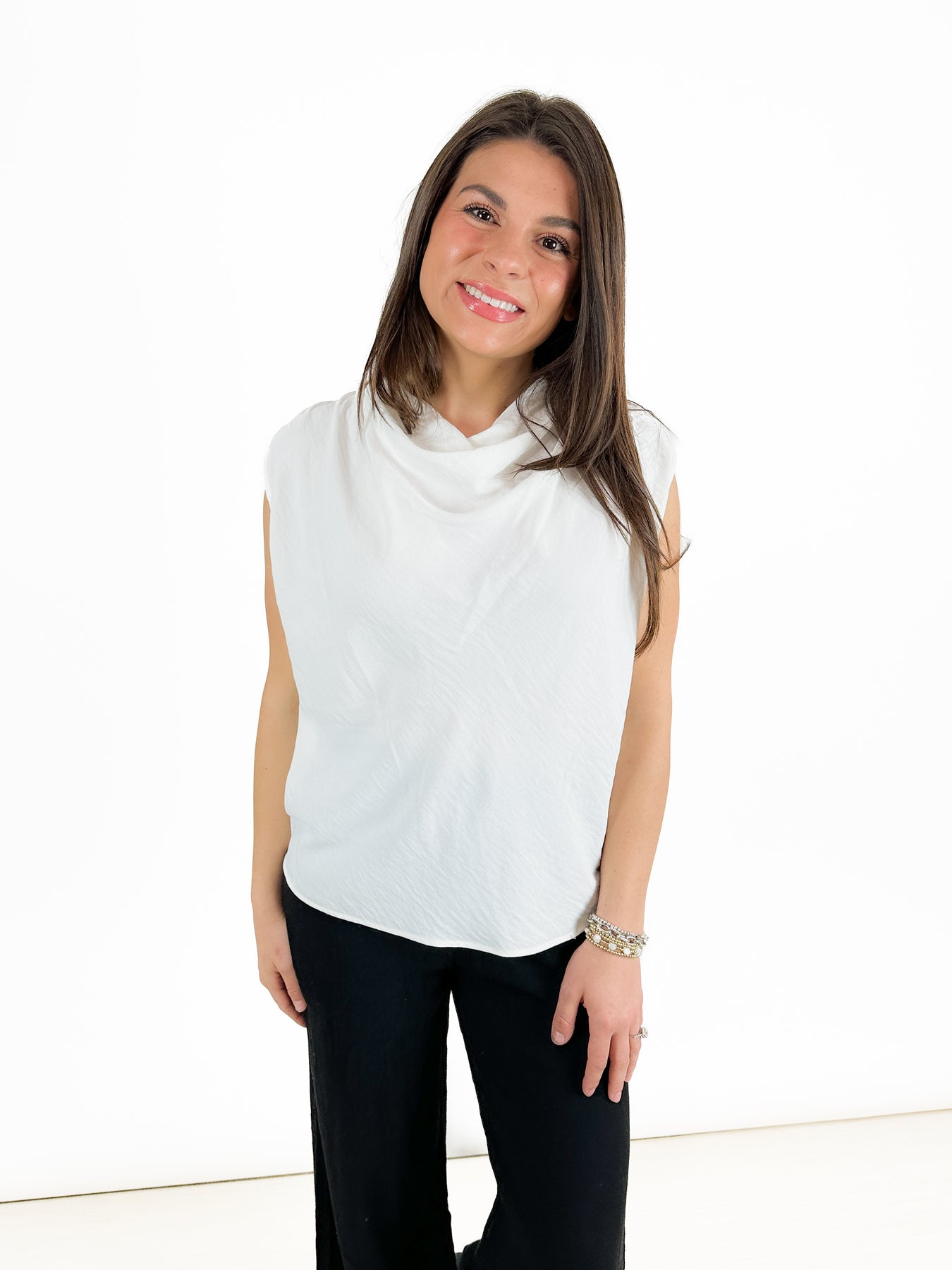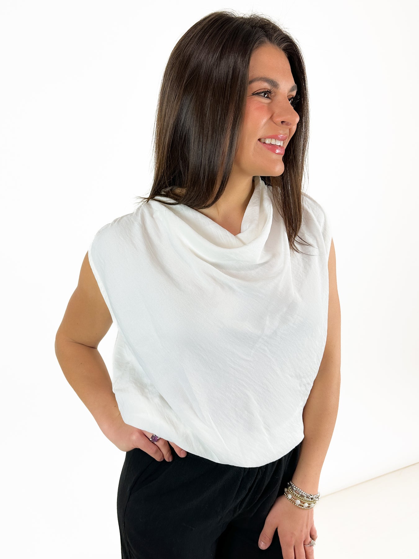 This is a beautiful, sleeveless white shirt with a cowl neck. A great length gives you the option to wear this top tucked or untucked. With its elevated white fabric, you wear this casual or dressed up depending on the bottoms you choose.