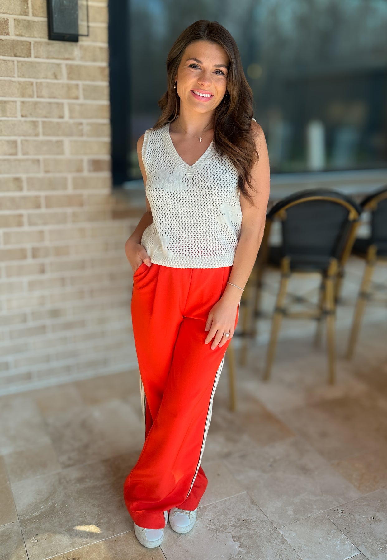 Simple, sleeveless, crocheted sweater vest. Done in a neutral knit, this top has a random flower pattern. A great basic piece.