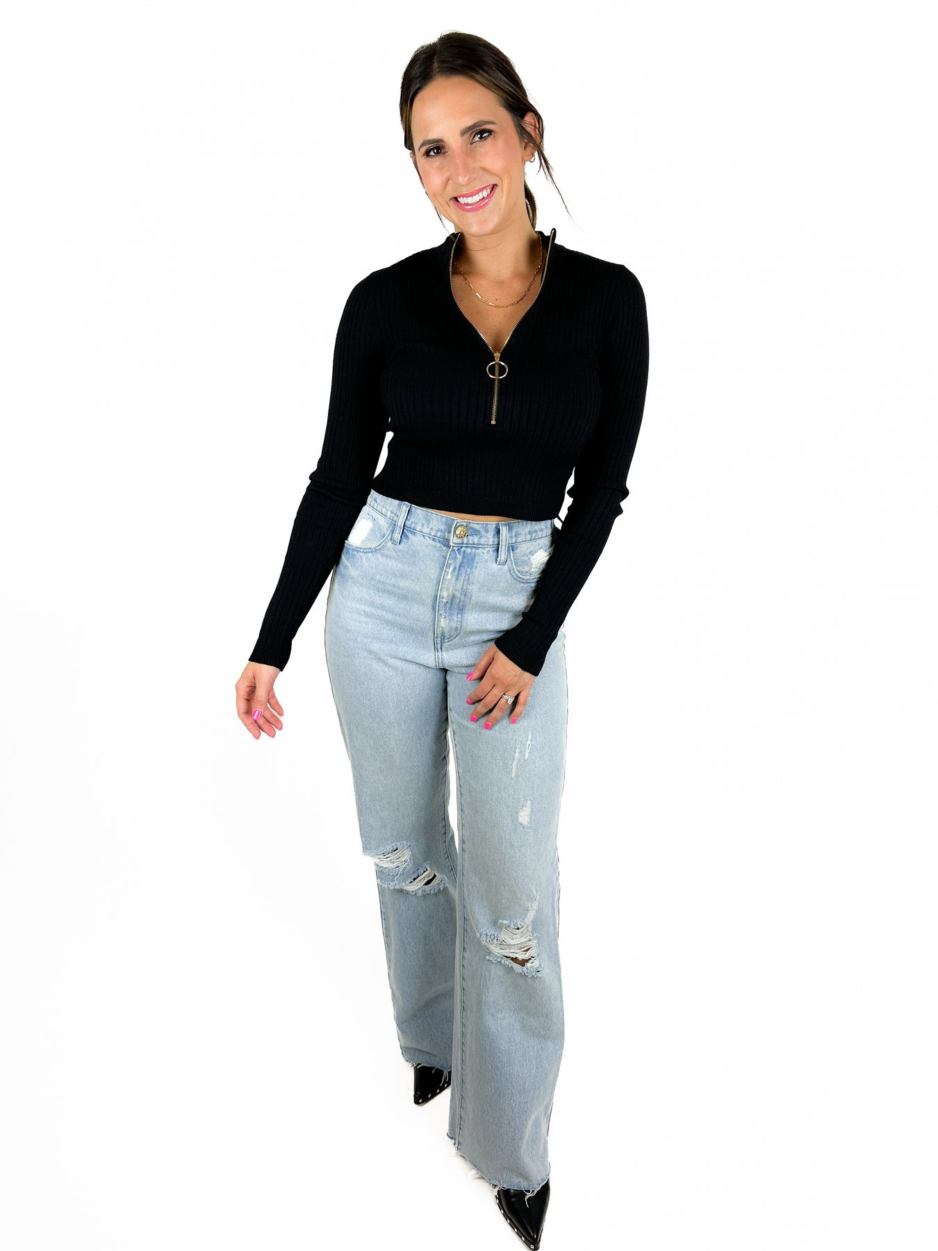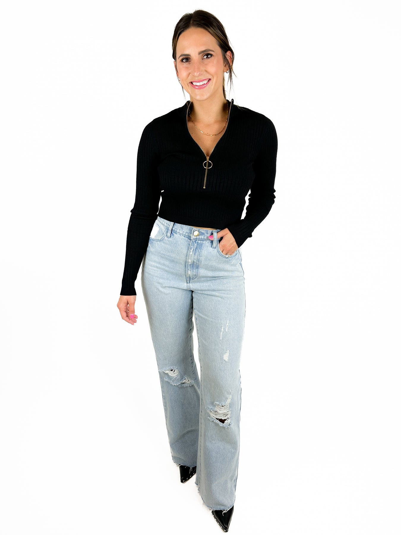 Basic black is a need! This medium ribbed, medium weight, quarter zip sweater pairs easily with just about anything. It has a collar and is short waisted to slightly cropped depending on the person. Looks great with denim, but is also so perfect for the “Skirt The Issue Miniskirt.” (Sold separately.)