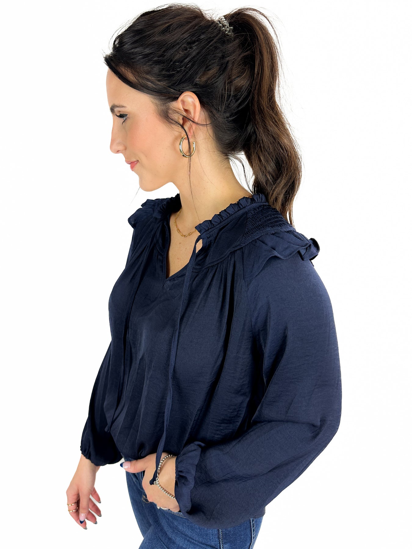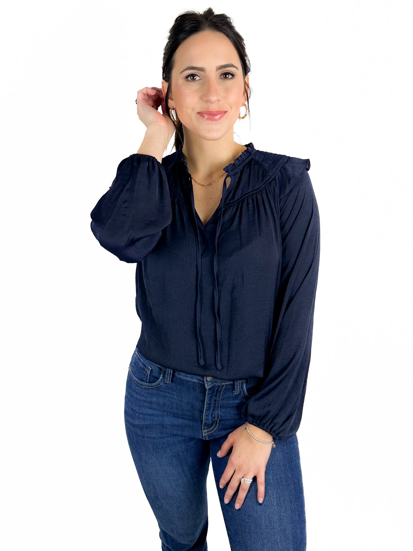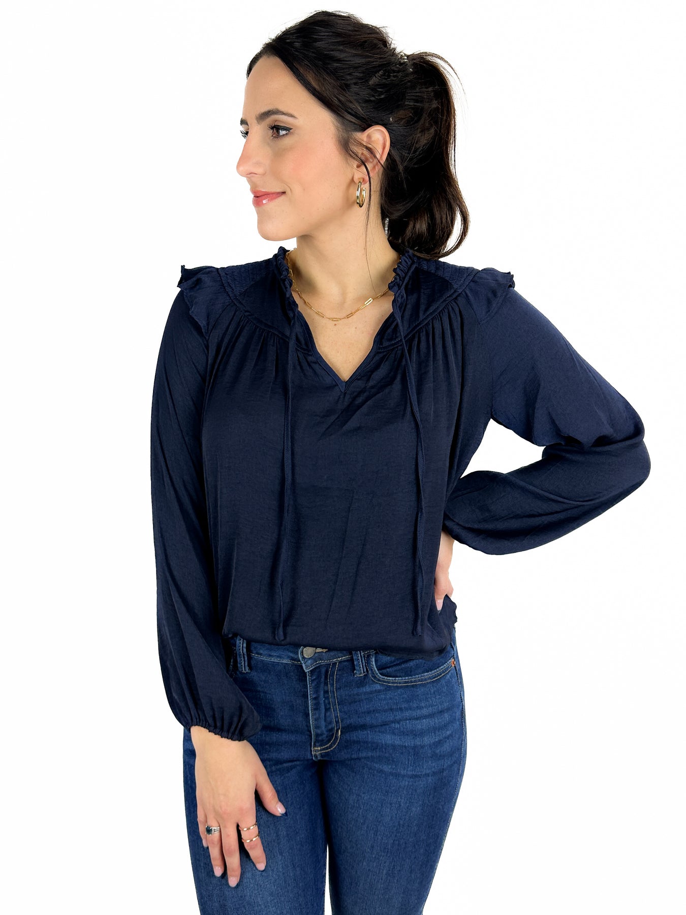 What makes a blouse special? Sometimes it’s the body style and sometimes it’s the fabric. This one has both. In a super soft, classic navy blue fabric, this blouse has a V-neck with a slight ruffle around the neck and shoulder. Wear it open or tied.