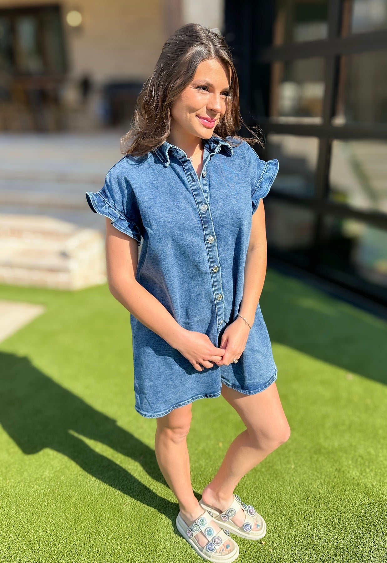 Throwing it back to the late 80's with this medium denim acid wash mini dress. The body style is a classic, straight fit shirt dress with a ruffled short sleeve.