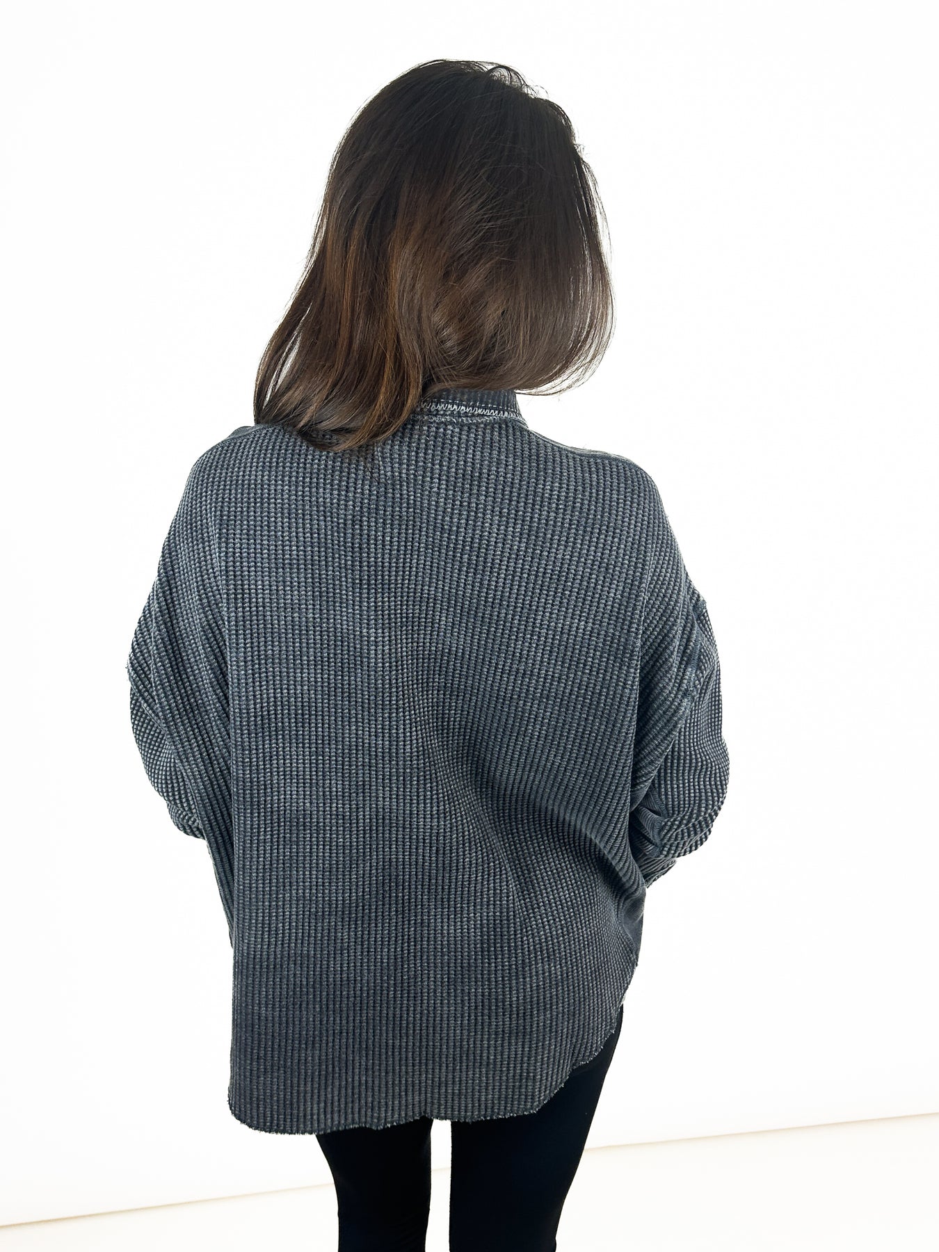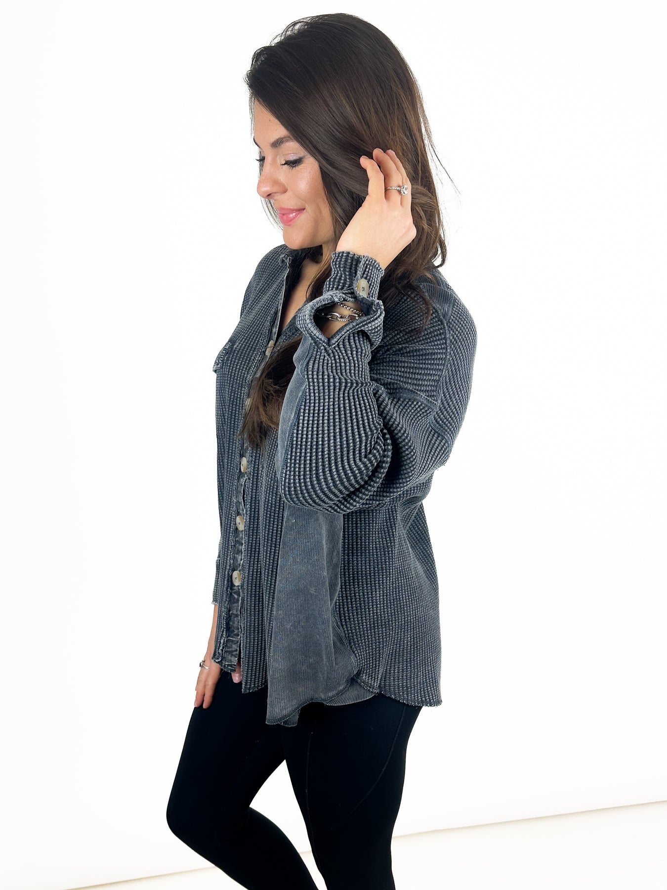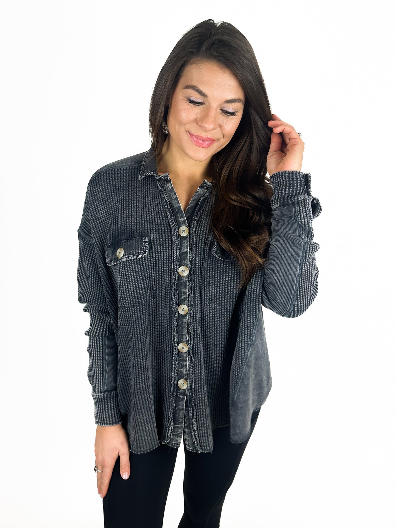 Wear it buttoned up or open as a layering piece. This waffle knit top has a high collar, and button-down front.