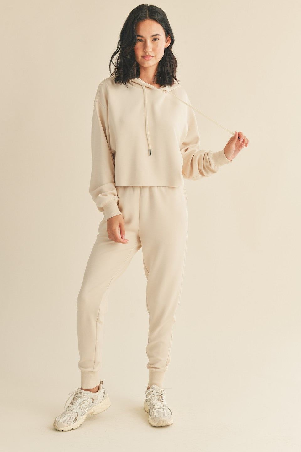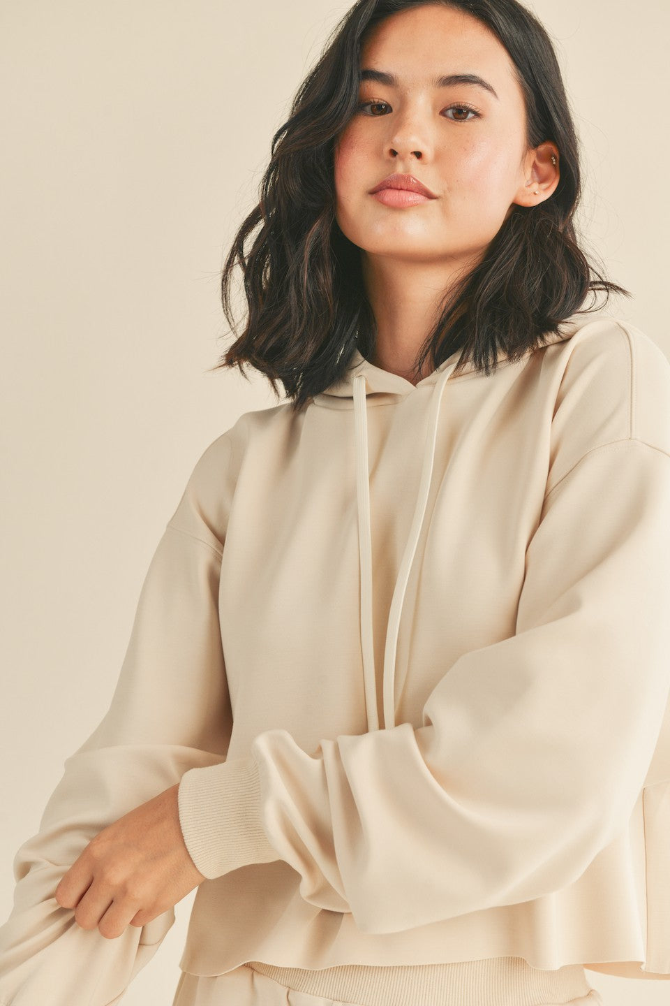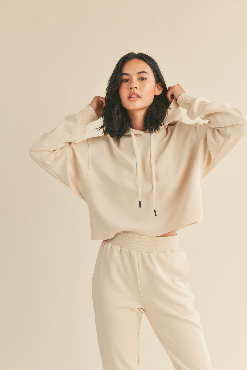 We all love a great hoodie. This neutral one is cropped, done in a scuba fabric with a drawstring hood.