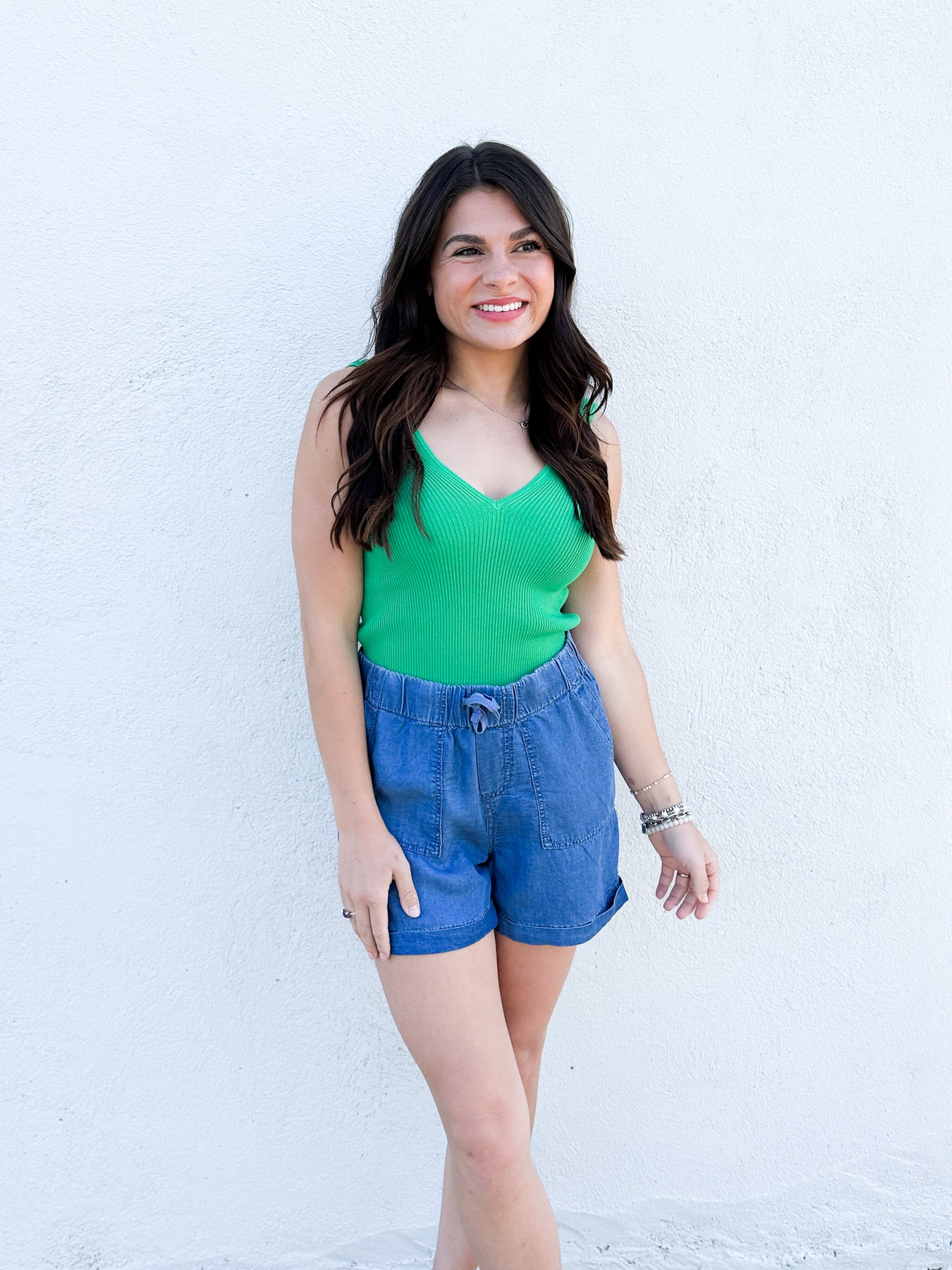 Denim shorts are a must. These lightweight, chambray wash shorts have an elastic waistband with a drawstring, pockets and a cuffed hem.