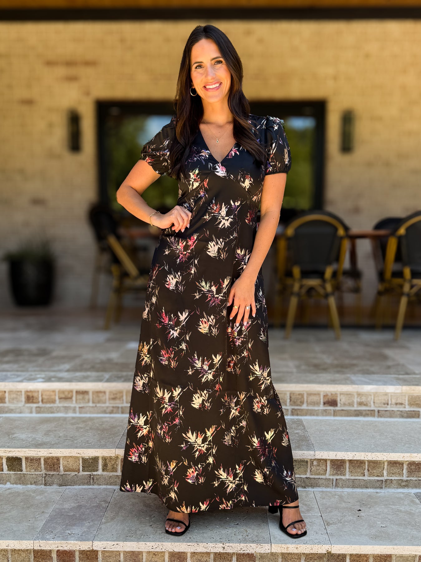 Loving everything about this dress. The black satin maxi dress has a shimmery metallic print, V-neck, short sleeve, and an empire waist.