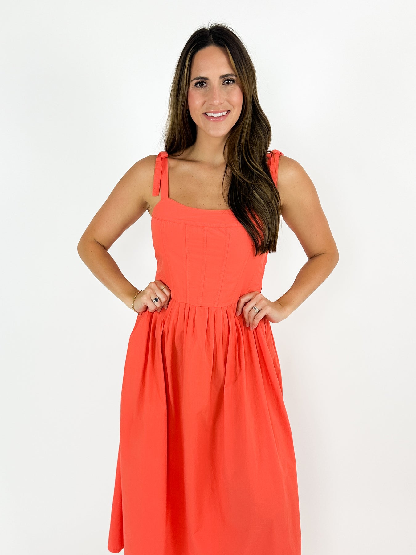 Stand out in this bright dress. The bodice is a corset style but has smocking at the back for comfort. The fixed bow detail on the straps completes the look. The flowy skirt is the perfect contrast to the bodice.