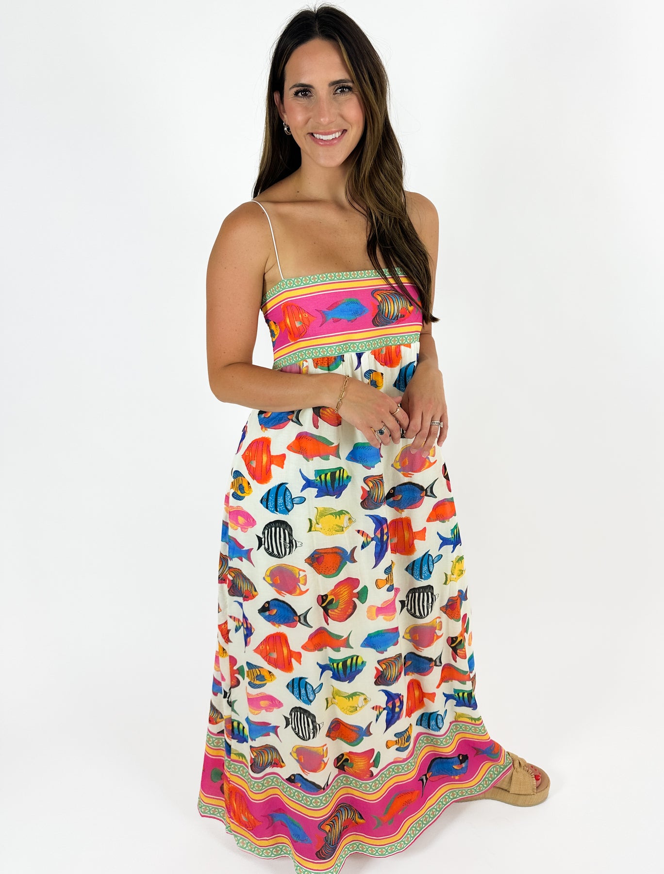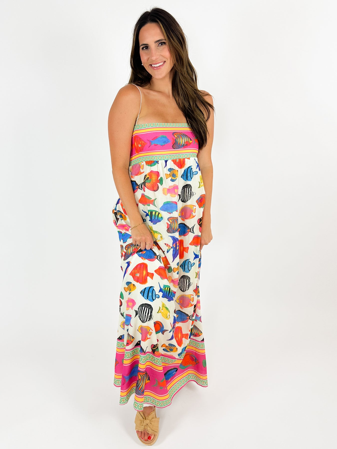 What a maxi dress! Empire waist, bright fish print, and optional bungy straps. We love the feel and flow of this dress. It is fully lined and has smocking detail at the back.