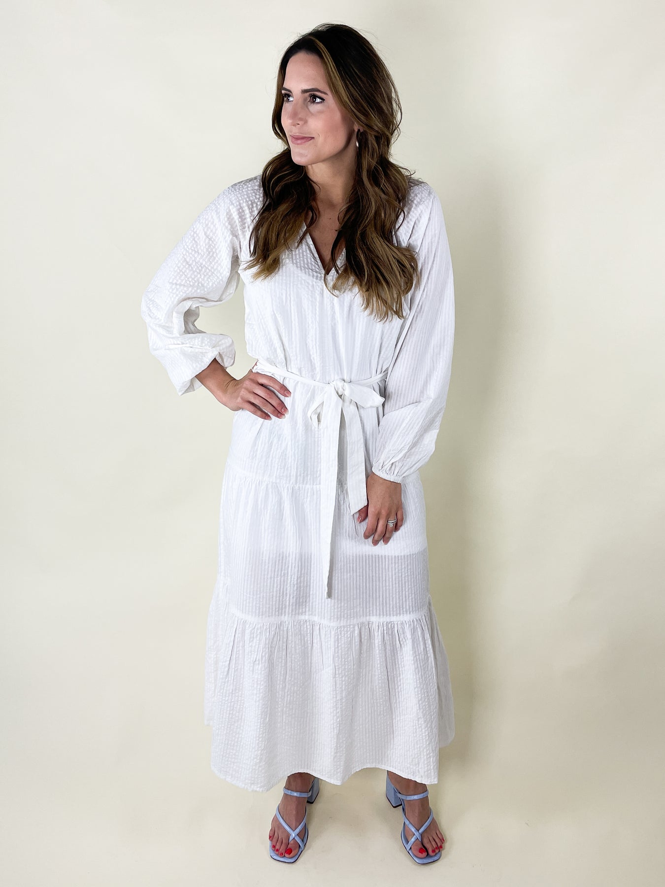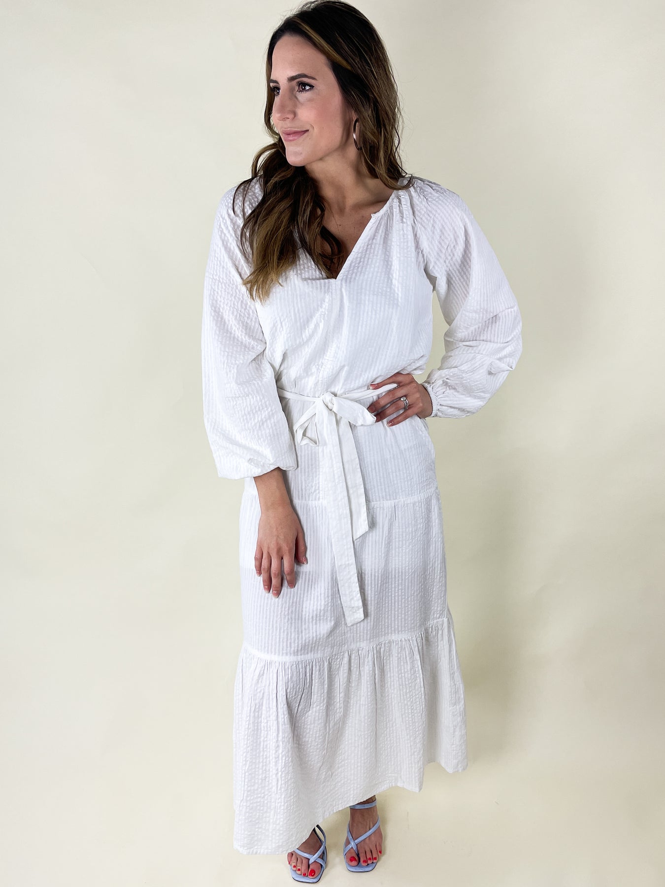 Anything white is classic. Everyone needs at least one white dress in their closet. Our beautiful Show Me The Ring Dress is a flowy, bohemian body style. Features include a V neck, tie at the waist and elastic cuff sleeve. This dress has a removable slip dress lining. The white on white stripe fabric is classic yet up to date. Perfect for the Bride-To-Be or anyone attending a white party, be sure to consider this dress. Dress is 100% cotton. Lining is 100% polyester. Model is wearing a Small.