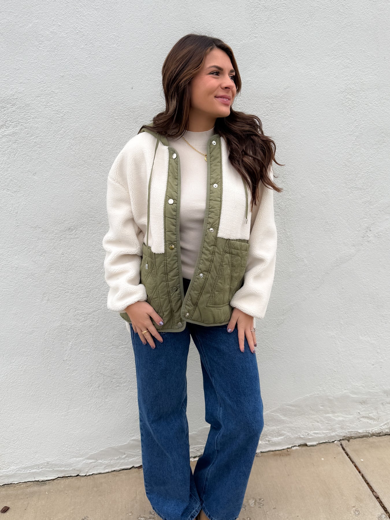 Mixed media jacket. Full body fuzzy material with a quilted hood and pockets.