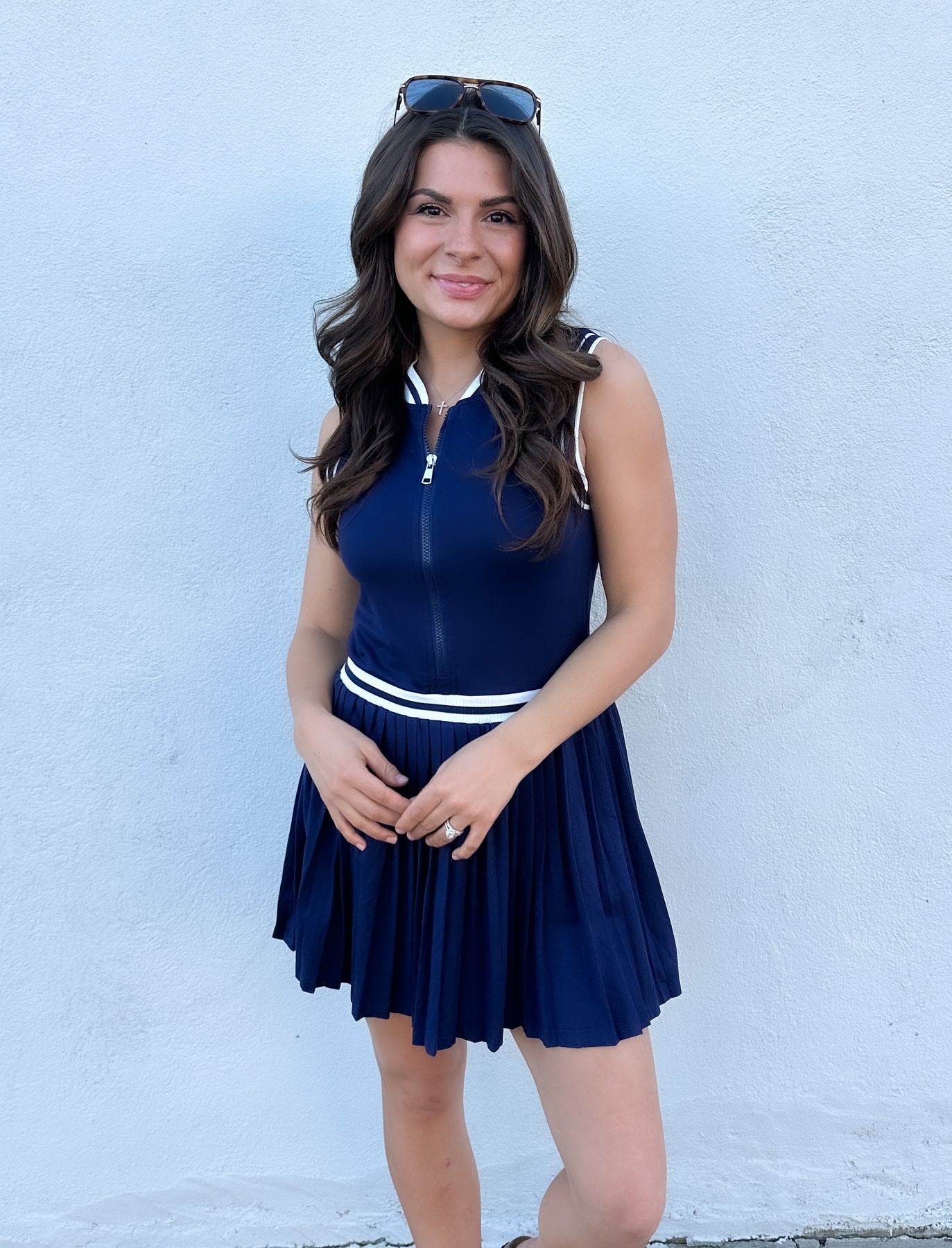There is an "active lifestyle" craze happening now! Whether or not you are a part of that trend, you can "sport" around town and be cute and comfortable. This one-piece outfit has a zipper front top with a pleated skort. It has striped detailing at the neck, arm holes, and waist.